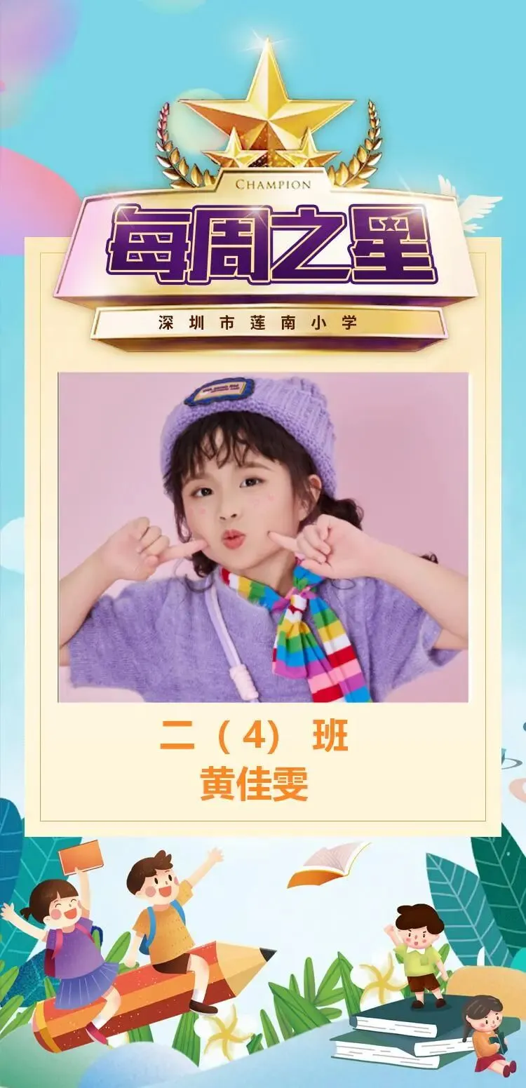 我是二年级 4 班的黄佳雯,很荣幸能获评本周的每周之星,这份认可让我心里满是感激。我是一个爱笑爱读课外书爱玩智力类游戏爱吃能吃辣的小朋友!