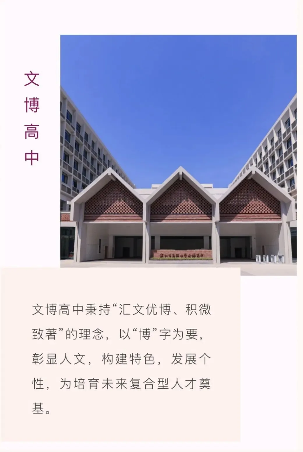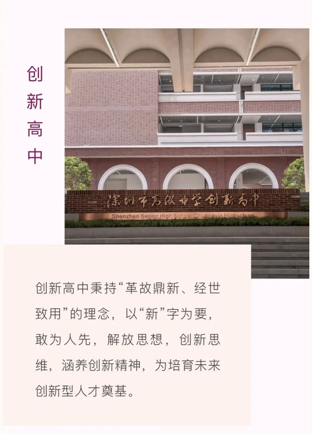 一园三校,共享联通校园。深高高中园内设三所高中,三校一体,上承深高优秀基因,又别开生面,各创新风,力求突破传统的高中办学样态,打造多元联动、资源共建、泛在学习、群落共享、智慧联通的校园生态。