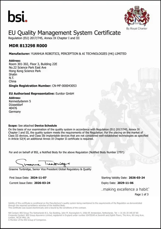 没这张证书,产品就不能在欧盟27国,以及其他认可CE标志的国家销售。连欧盟海关都过不了,更别说参与欧洲医院的招标采购了。这次颁证的BSI,是英国王室特许授权的机构,也是全球最权威的认证机构之一。它发的MDR证书,在全球医疗器械行业认可度极高。元化智能能顺利通过审核,说明它在产品设计、生产制造、风险管理、上市后监控等所有环节,都达到了欧盟的严苛标准。