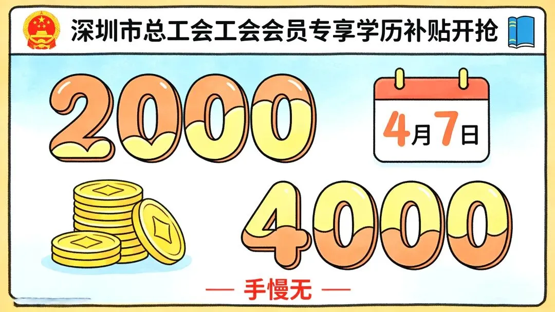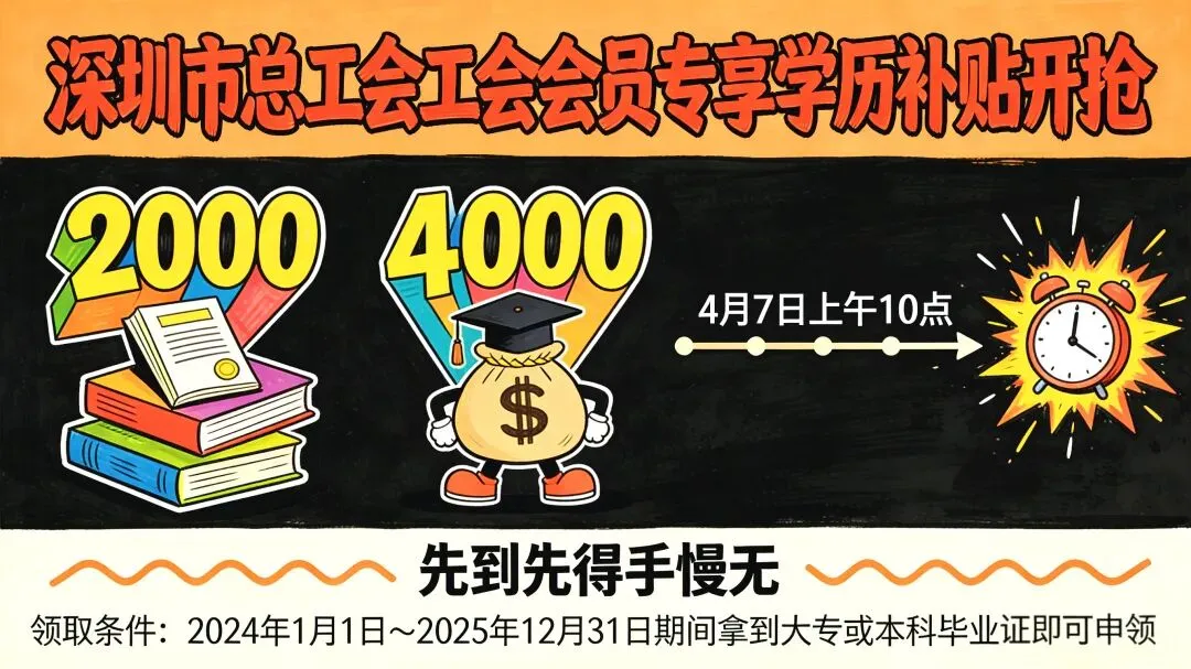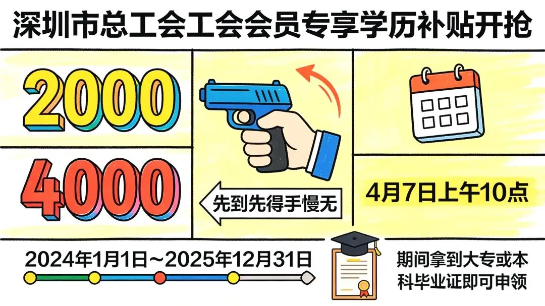 深圳工会给职工朋友准备了一份“毕业礼”——最高2000元学历补贴,4月7日上午10点开抢,一共4000个名额,先到先得。如果你在2024年1月1日到2025年12月31日期间拿到了大专或本科毕业证,这篇推文你一定要看完。