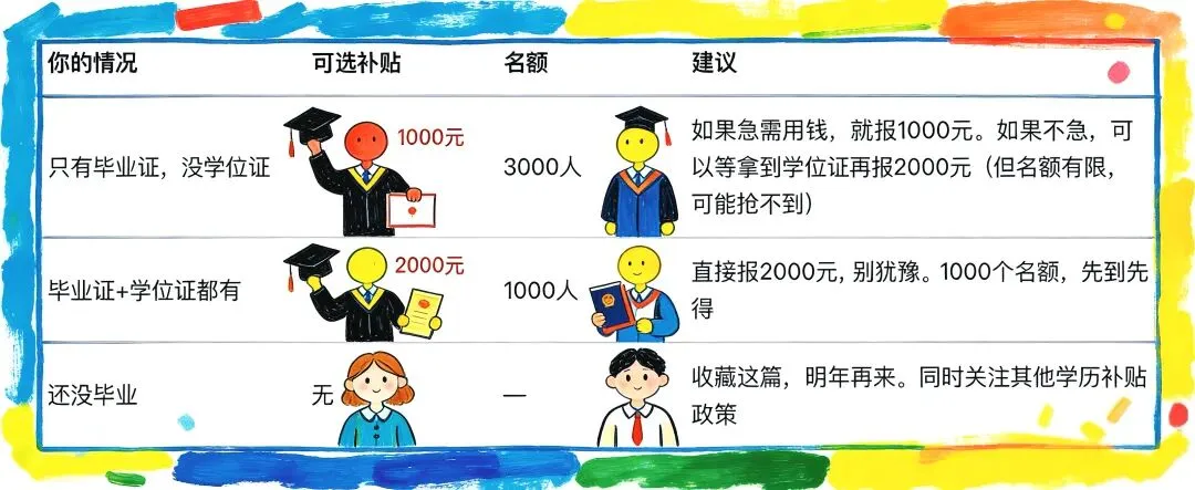 如果你现在只有毕业证,没有学位证,想清楚再选。选了1000元,以后拿到学位证也不能补2000元。如果学位证快到手了,可以等明年。但明年政策会不会变、名额够不够,谁也说不好。