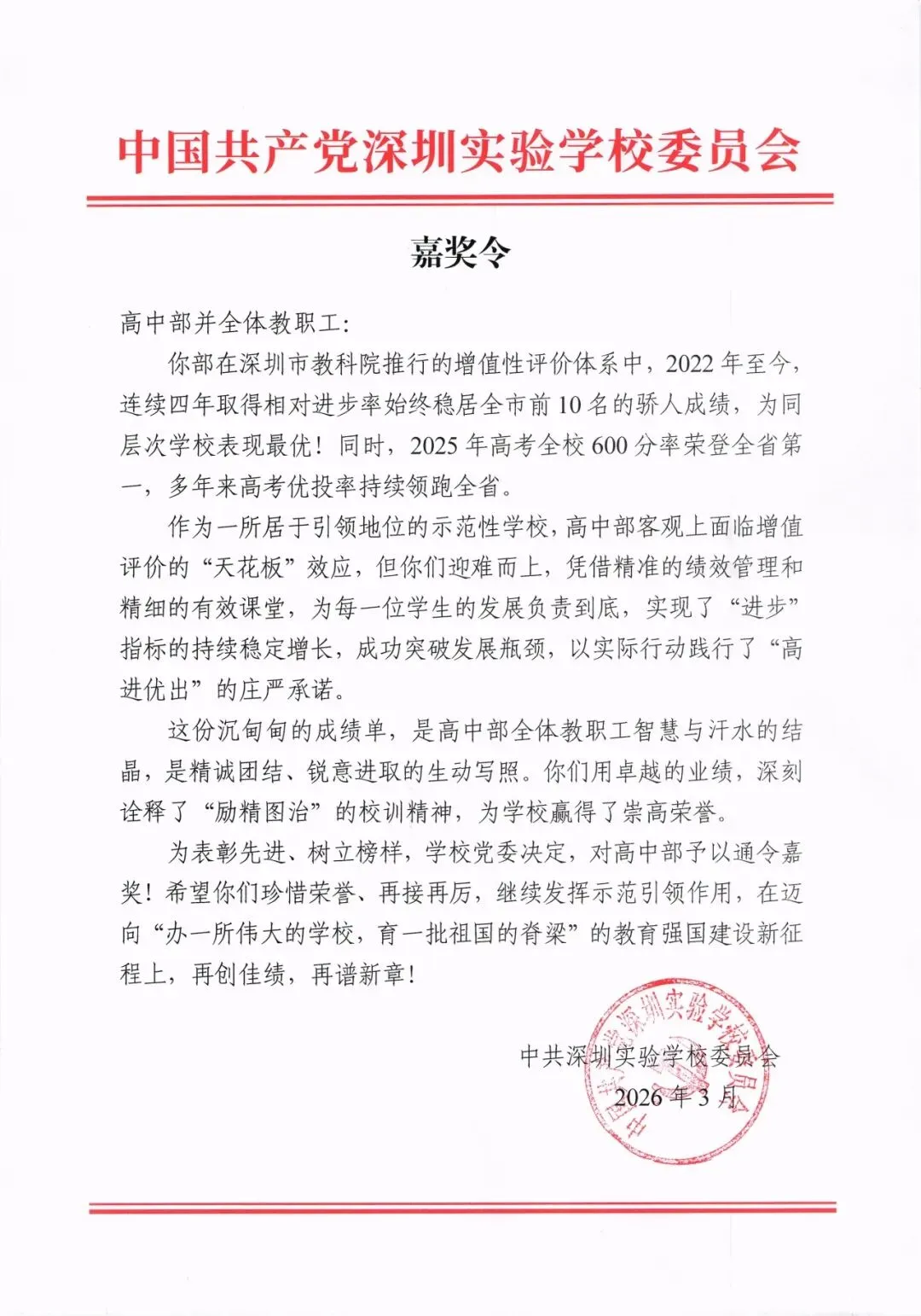 近期,深圳实验学校党委向高中部发布嘉奖令,就高中部高考成绩持续领跑,实现“高进优出”的卓越育人成效予以通令嘉奖。
