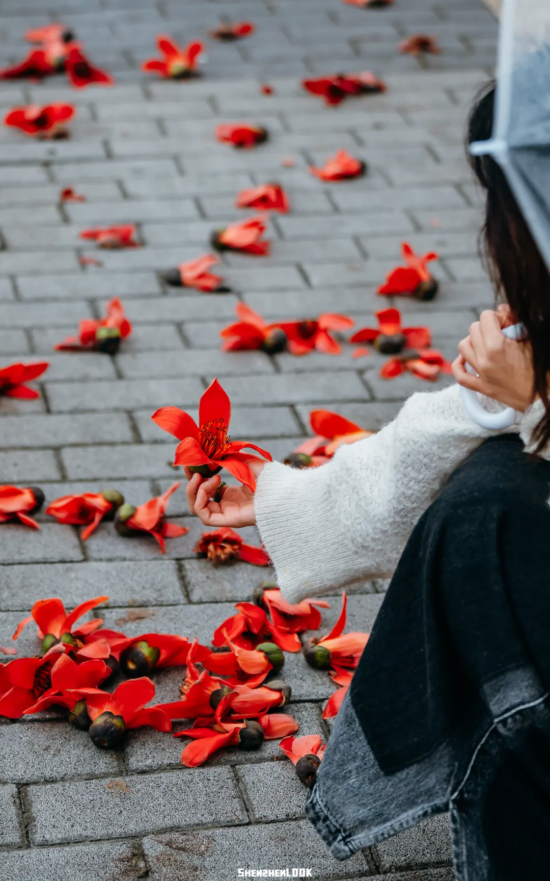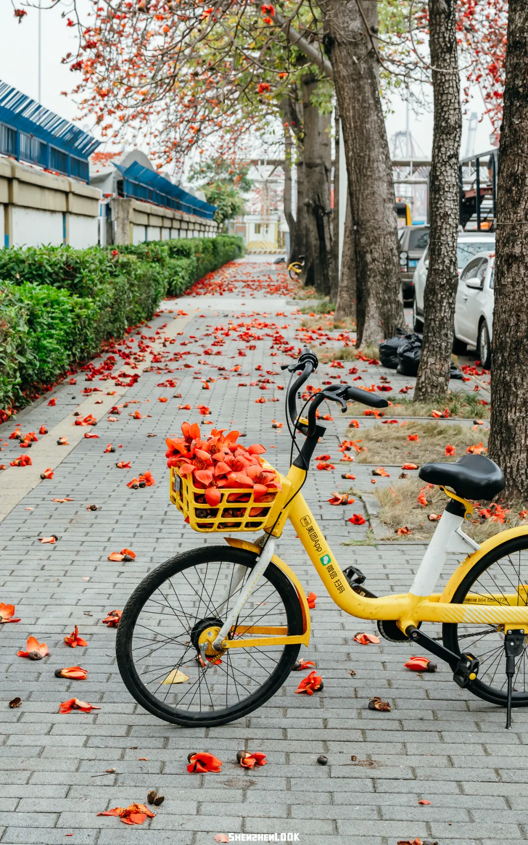 每年这个时候,木棉盛开后又落了满地,吸引不少行人前去收集,在地上、自行车上摆出不同的造型。