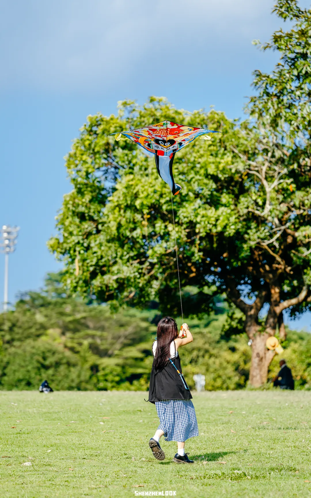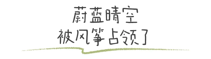 天空除了蓝天白云,还有各种风筝。孩子们抓着手中的线,在草坪上撒欢奔跑,让风筝越飞越高。