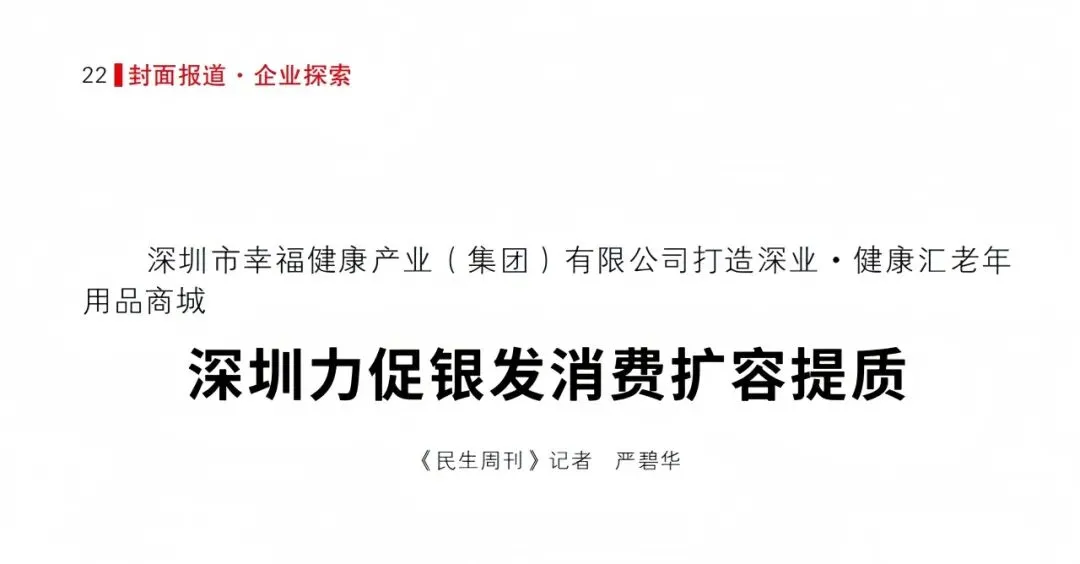 日前,由人民日报社主管主办的《民生周刊》杂志,在第四届人民康养大会上重点聚焦深圳银发经济创新实践,刊发专题报道《(引题)深圳幸福健康集团打造深业·健康汇老年用品商城(主题)力促银发消费扩容提质》,深度解读深圳市幸福健康产业(集团)有限公司打造的深业·健康汇老年用品商城的创新模式与亮眼成效。