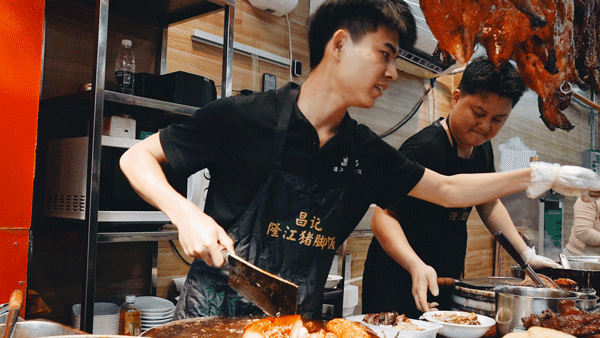 店里的看家产品四点金,用潮汕话说就叫做“四点”,是介于猪蹄和蹄髈之间部分的那块肉,也是很多资深食客提名的猪脚饭最精华的部分。来昌记的人,大多数都是奔着这碗四点金饭来的。因为很抢手,高峰期的时候一锅卖完了,都要再等25分钟才有新的。