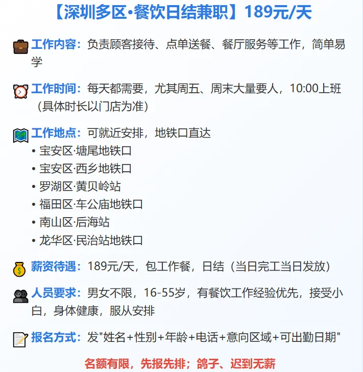 >【深圳兼职】多地区·餐饮日结兼职丨189元/天,每天都需要,尤其周五、周末大量要人,负责顾客接待、点单送餐等工作.