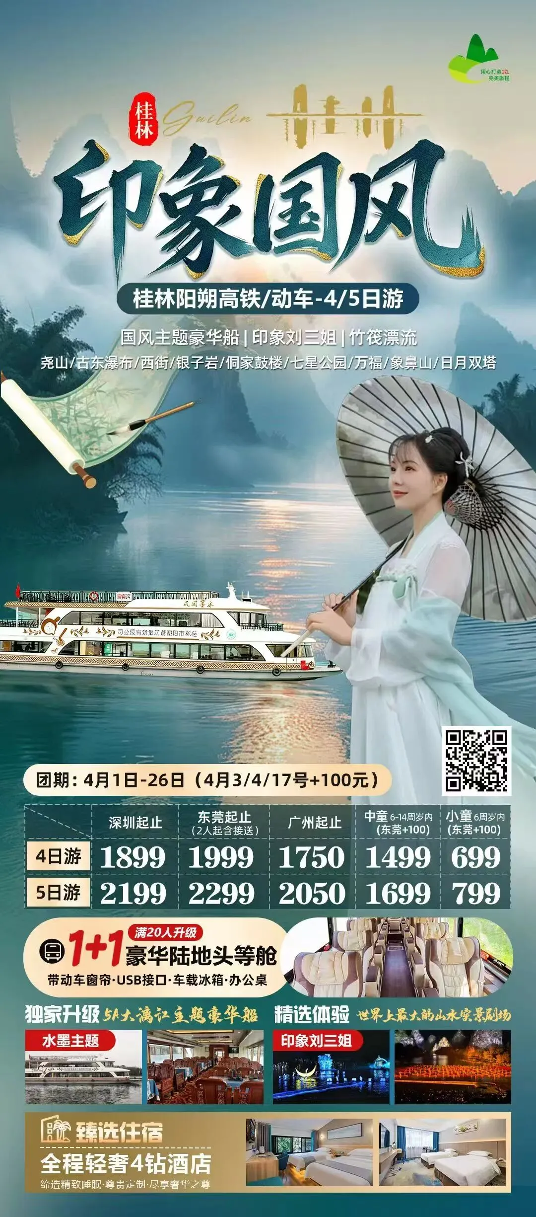 气候情况:4-5月桂林气温15-26℃,温暖湿润,偶尔有小雨,烟雨朦胧的意境更显桂林山水的韵味,穿薄外套+短袖即可,体感舒适。