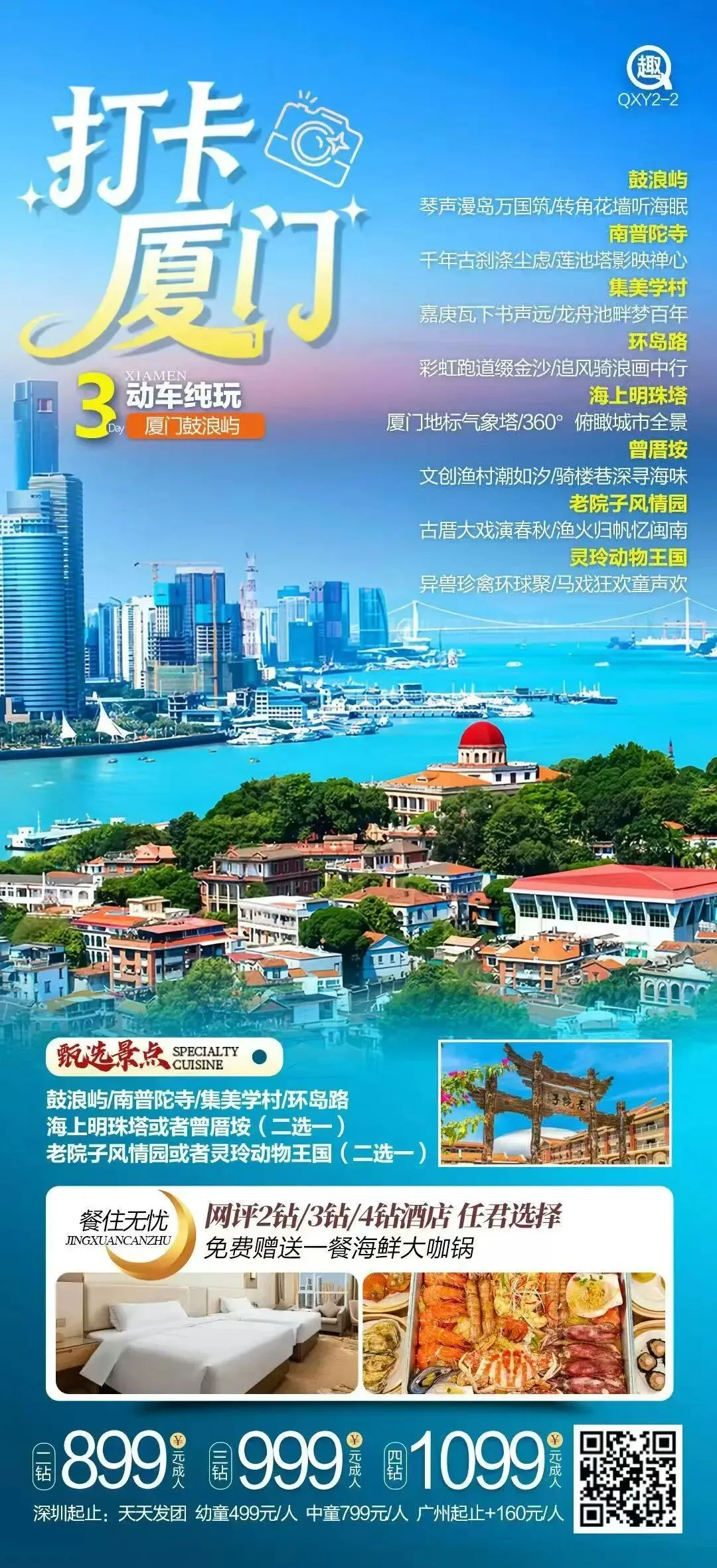 必逛景点:鼓浪屿(登日光岩,逛菽庄花园,感受文艺小岛风情🏝️)、曾厝垵(逛吃特色小吃,感受海滨烟火)、环岛路(骑行赏海景,看日出日落)、南普陀寺(香火缭绕,感受禅意与宁静)。