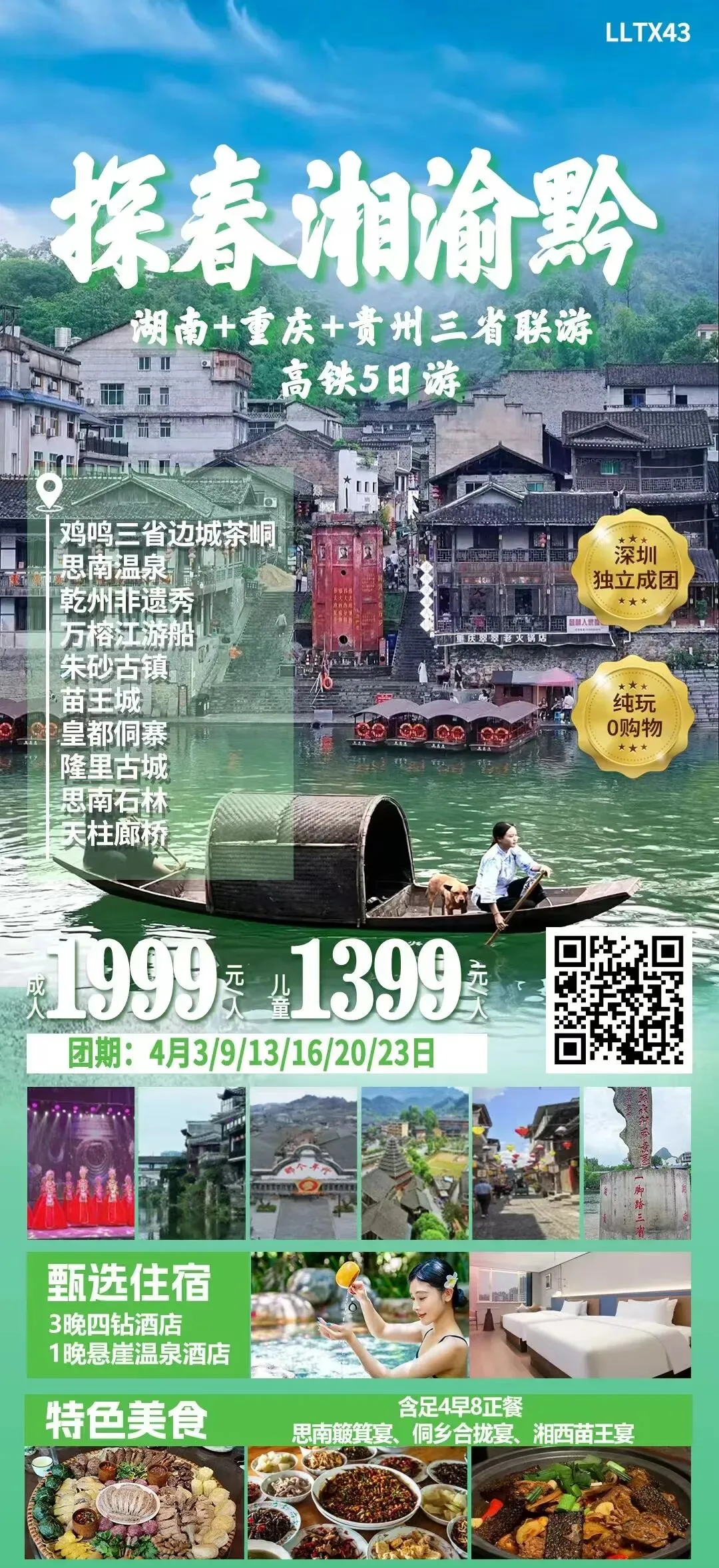 深圳高铁起止贵州+湖南+重庆三省联游5天1999,边城茶峒、思南温泉、乾州古城非遗秀、万溶江游船、朱砂古镇、隆里古城、思南石林天柱廊桥