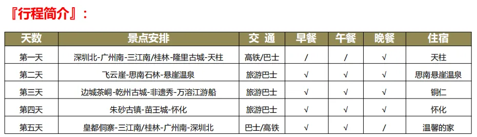 早餐后前往【皇都侗寨】坐落在百里侗文化长廊的中心地带,皇都侗寨由头寨、盘寨、尾寨、新寨四个部分组成,其中前三个寨子连成一体,新寨则位于一个半岛上,通过风雨桥(普修桥)和公路与其余寨子相连。皇都侗寨是侗族村寨保留最为完整的地方之一,拥有500余座吊脚楼,形成了气势磅礴的侗族吊脚楼群。寨中现存有4座鼓楼和1座风雨桥。这些传统建筑不仅展示了侗族独特的建筑风格,还体现了其深厚的文化底蕴。 体验拦门酒,品当地合拢宴,听侗族大歌,午餐后乘车约2小时车程前往三江南/桂林高铁站乘坐动车返回广州南,抵达后乘坐高铁返回深圳北,结束愉快旅程。