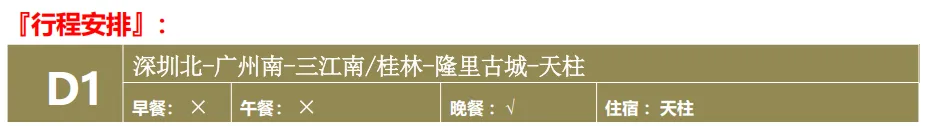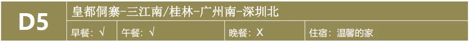 早上深圳北乘坐高铁前往广州南(约 0.5 小时),后换乘动车前往三江南/桂林(约 3 小时),抵达后导游接团,