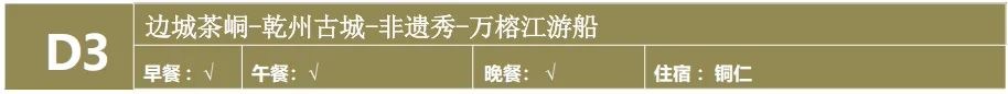 早餐后乘车约3小时车程前往【边城茶峒景区】位于湘、黔、渝交界处,始建于嘉庆八年(1803年),素有“一脚踏三省”之称,是国家第一批特色小镇,同时也是湘西四大名镇之一。边城是文学大师沈从文的著名中篇小说《边城》的原型地,沈从文先生将茶峒古镇优美的风景、淳朴善良的风俗人情等融为一体,勾画出了田园牧歌般的边城风貌。此城由群山环抱,山中有城,城中有山;城垣逶迤,河水悠悠,青石道整洁风雅,吊脚楼古色古香,白塔耸立,古渡摆舟;垂柳下的石级上,仨俩姑嫂在捶衣洗菜,清水江上,四五渔民正放鹭鸶叼鱼——好一幅如诗如画、美轮美奂的风情。后乘车约1小时车程前往【乾州古城】始建于唐朝,有着1200多年的历史。古城的建筑风格独特,有着浓厚的地方特色。观《乾城非遗秀》苗疆“百老汇”,湘西魂炸裂!巫傩绝技、苗鼓震天、土家织锦…演员从你身边飞过。乘【溶江游船】船会沿着江水缓缓行驶,两岸的吊脚楼和红灯笼在水中映出倒影,船上的情景演绎结合得恰到好处,仿佛置身于沈从文笔下的梦境。行程结束后乘车约1.5小时车程前往铜仁酒店休息。