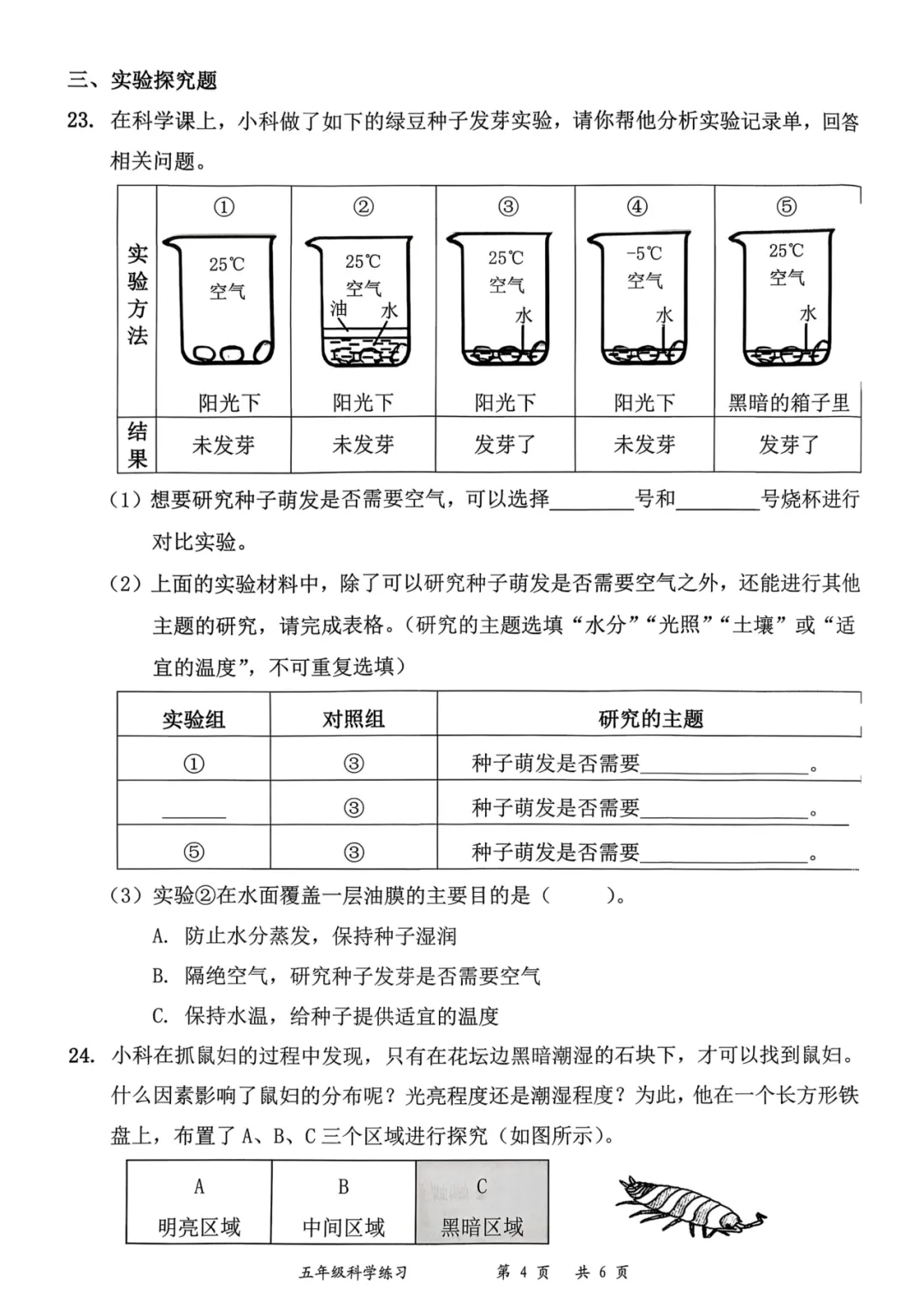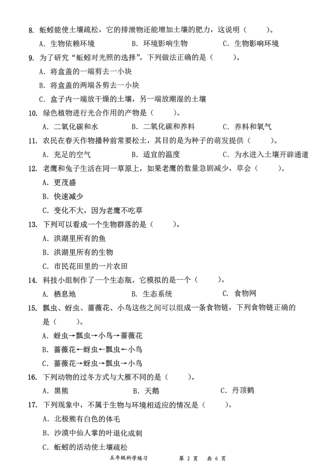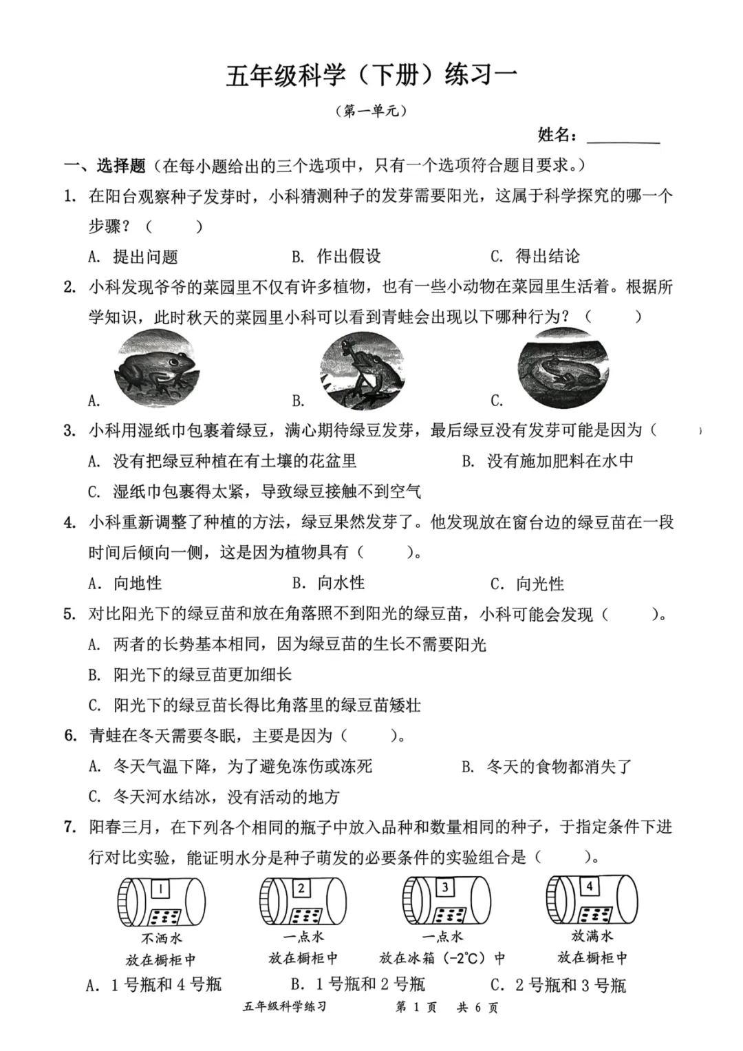 深圳市罗湖区2025-2026学年五年级科学(下册)练习一(第一单元)