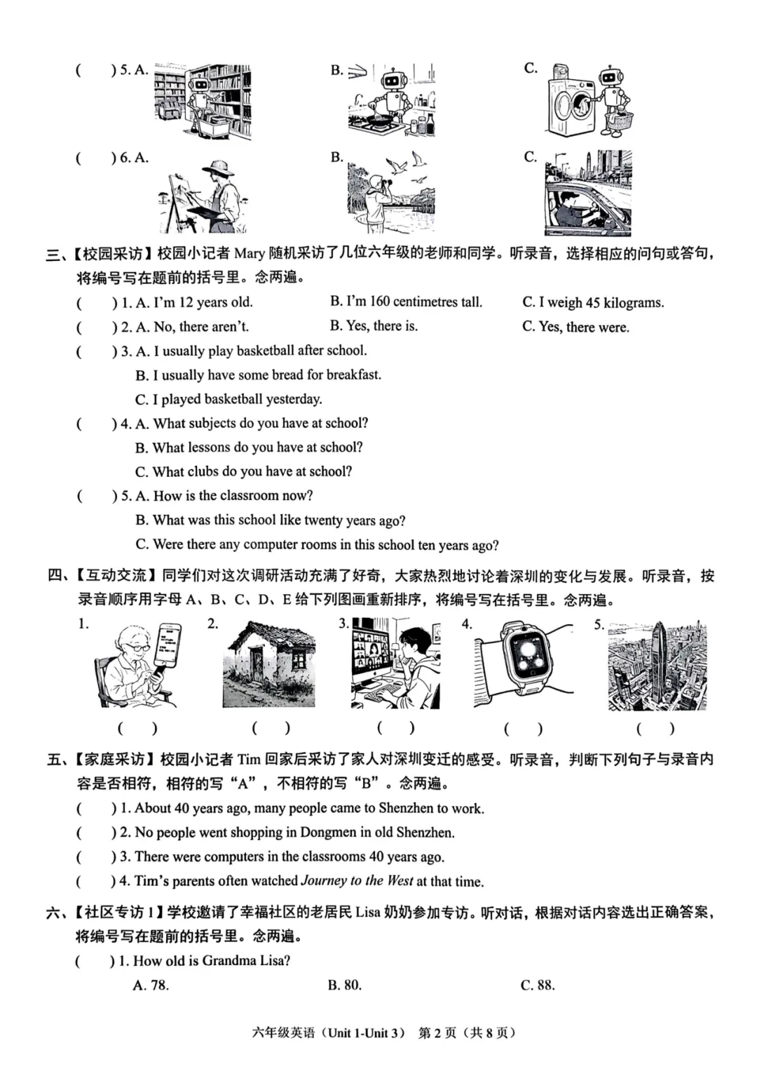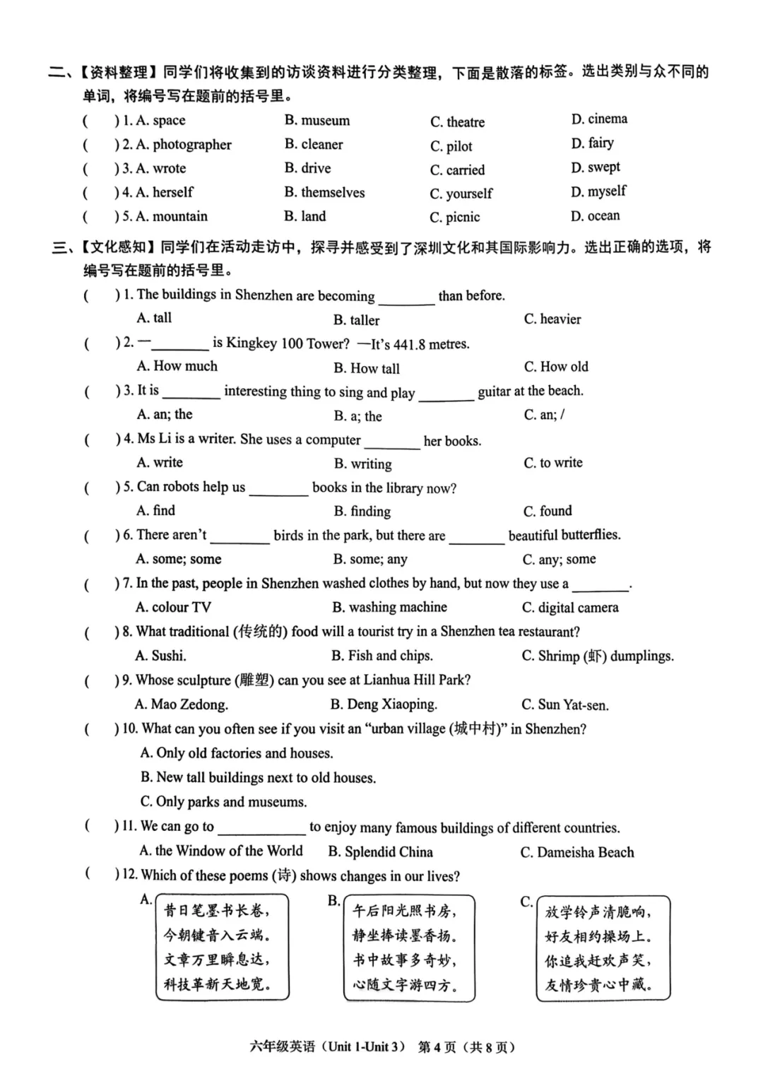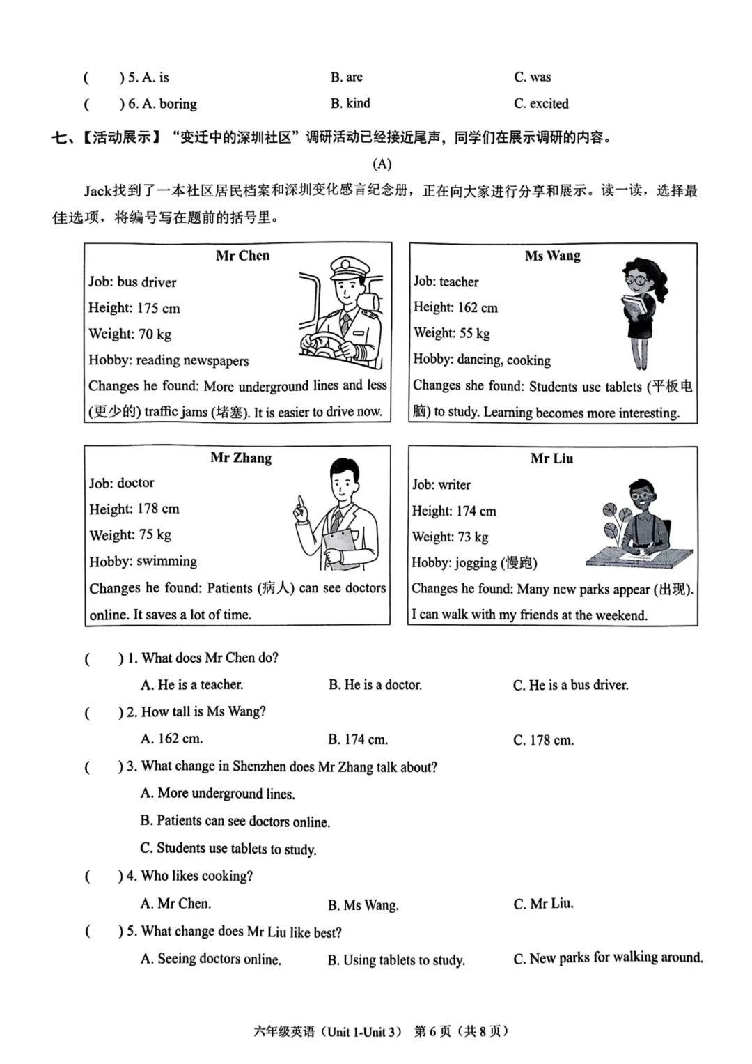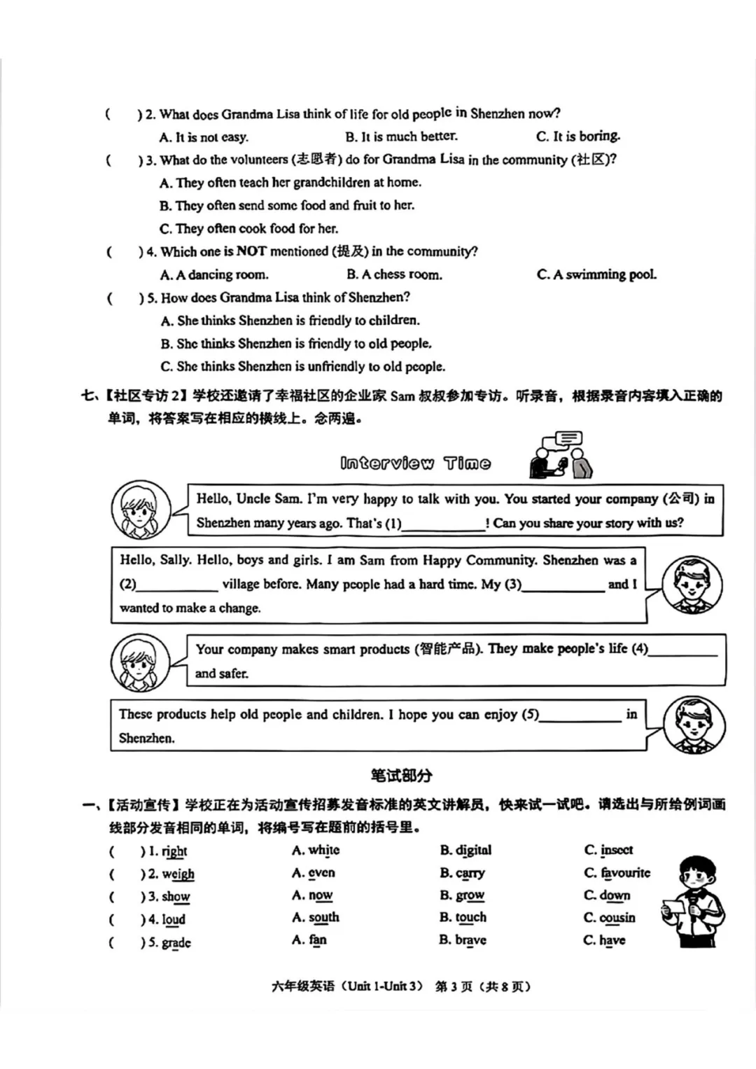 深圳市龙岗区2025-2026学年六年级下学期学科素养巩固英语(Unit1-Unit3)