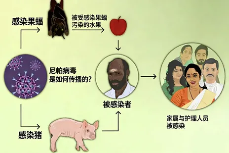 果蝠是尼帕病毒的主要天然宿主。与受感染果蝠和主要中间宿主猪的接触是人类感染尼帕病毒的主要原因。