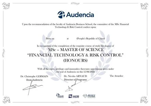 授予证书:学生修满课程学分并通过论文答辩后,法国南特高等商学院将授予金融科技与风险控制理学硕士学位证书,并可在中国教育部留学服务中心获得认证。