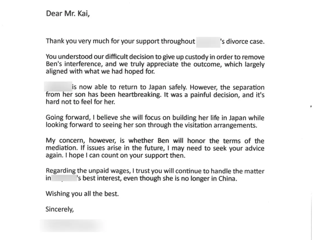 案件历时半年有余,最终通过诉讼及多方协调机制圆满解决,委托人的核心诉求获得超预期实现,委托人本人及其父亲均致信表达诚挚谢意。