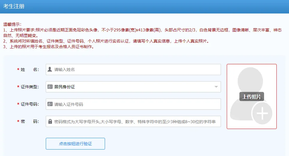 登录后需完善个人基本信息,并上传照片,系统将对所填写的姓名、证件类型、证件号码以及个人照片进行实名认证。