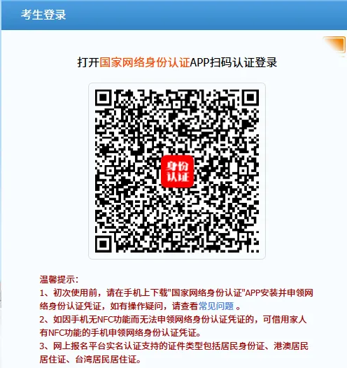 实名认证成功后,使用“国家网络身份认证”APP 右上角的扫码功能,扫描报名系统上的二维码完成登录。