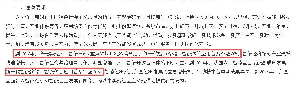《关于深入实施“人工智能+”行动的意见》,明确提出“到2027年,率先实现人工智能与6大重点领域广泛深度融合,新一代智能终端、智能体等应用普及率超70%”“到2030年,人工智能全面赋能高质量发展,新一代智能终端、智能体等应用普及率超90%”。这意味着AI智能技术,即将大规模应用到人们的实际工作生活和经济发展中。