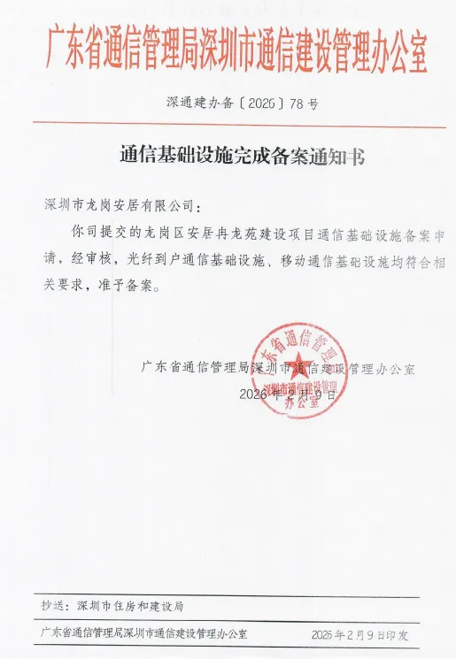 受建设单位委托,我司于2026年1月10日开始,对安居冉龙苑进行无线室分和光纤入户检测工作。该项目时间紧,任务重。为满足客户要求,我司检测人员加班加点、不懈努力,在施工单位通力配合下顺利于甲方要求的时间点内完成检测、整改、资料整备及验收工作。目前,该项目已顺利取得深圳市通信建设管理办公室发放的“通信基础设施完成备案通知书”。我司的检测质量及服务品质受到了客户及施工方的一致好评!现场图:
