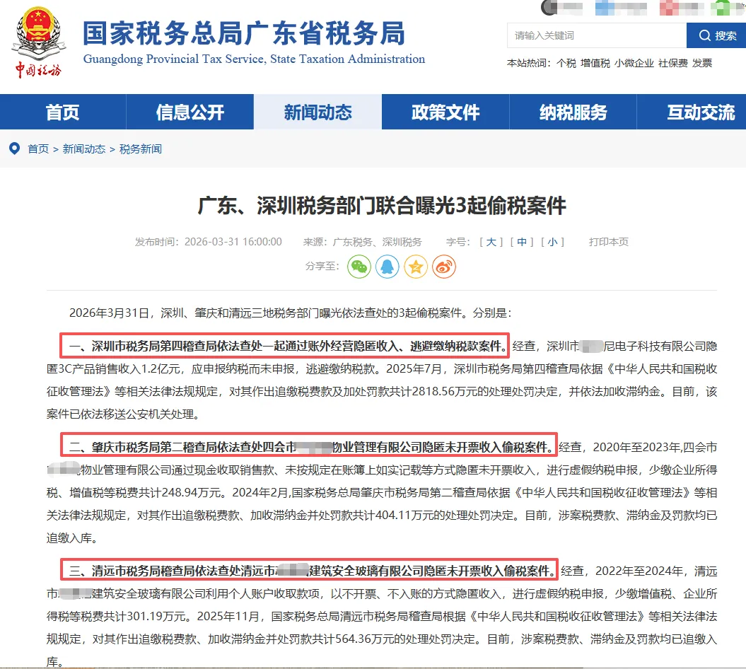 就在2026年3月31日,广东、深圳税务部门公开曝光了多起涉税违法案件,其中深圳市XX尼电子科技有限公司因隐匿上亿元收 入被稽查一时间成为了行业热议的焦点。