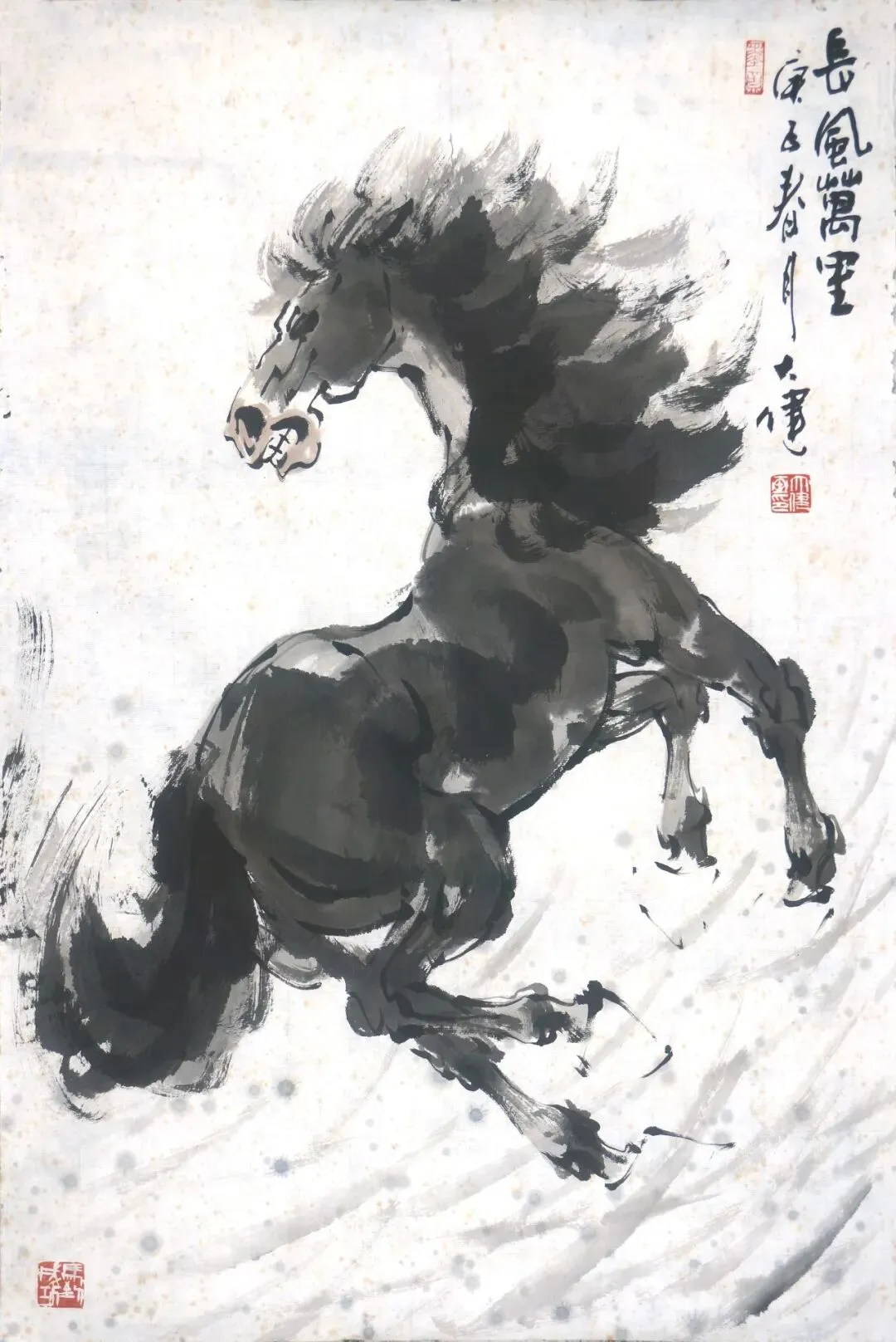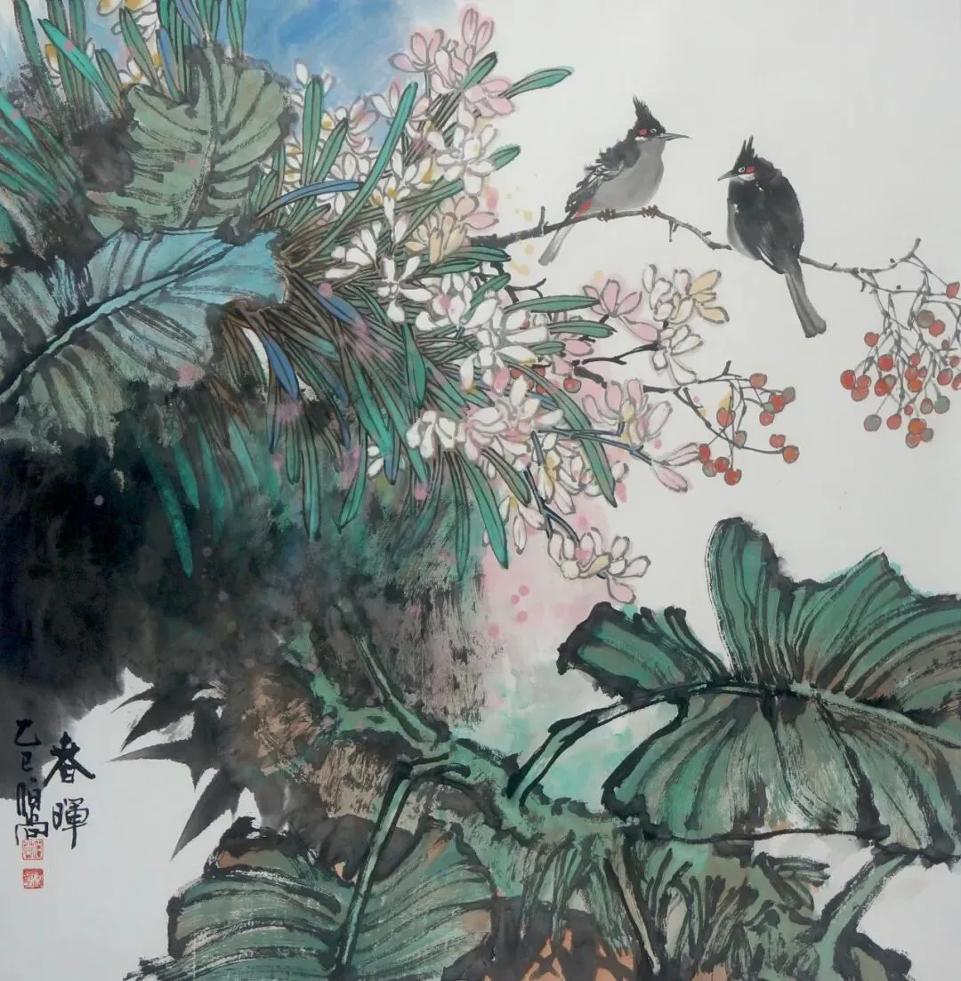 作品浅析:这幅《春晖》以生动传神的笔墨,描绘出春日枝头鸟语花香的盎然生机。画家以浓淡相间的墨色勾染禽鸟的体态与羽毛,再以朱砂点睛,顿使鸟雀形神兼备,呼之欲出。花叶部分则以富有节奏的墨色与青绿挥洒,阔叶舒展,细叶挺拔,其间点缀粉白花朵与鲜红浆果,色调明丽却不失雅致。
