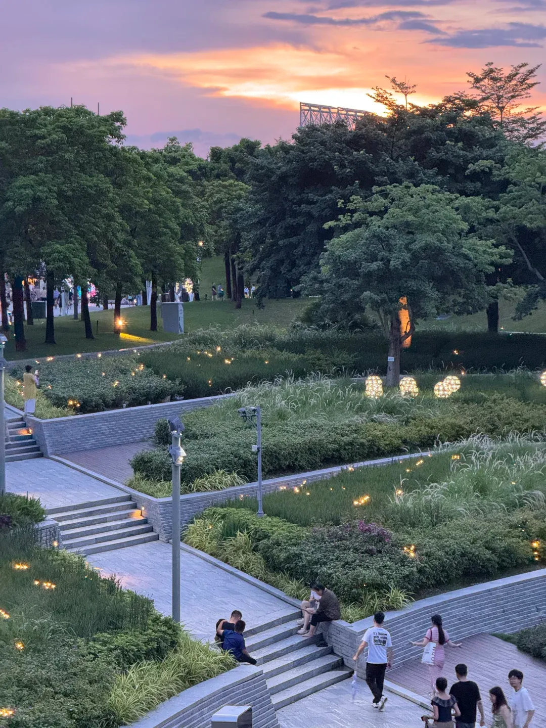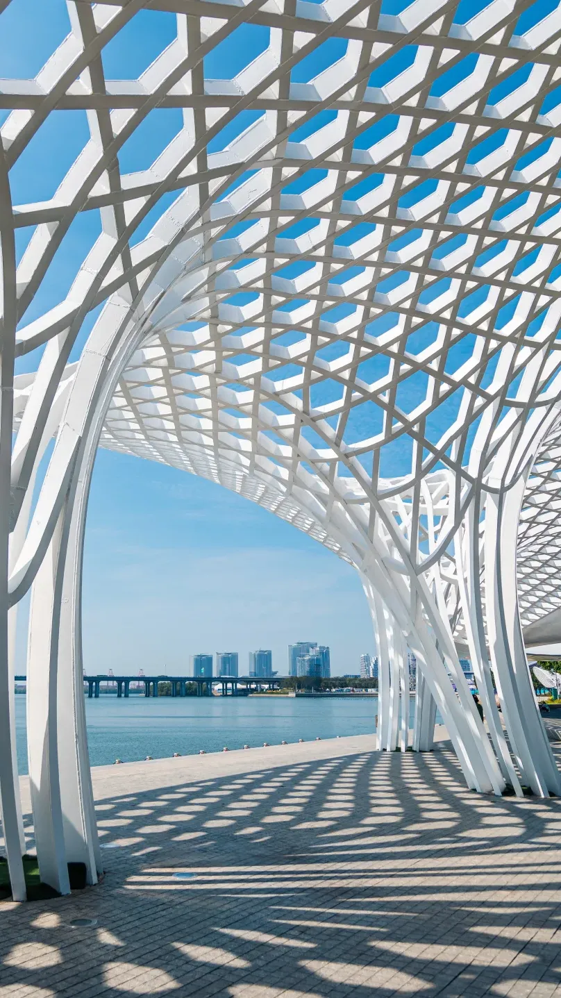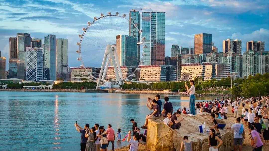 直到我们站在湾区之眼前。摩天轮悬在远处暮光低垂的海面上,滨海廊桥蜿蜒向前,书城灯火通明,海风带着城市的气息扑面而来。远处是新城天际,海面波光点点。