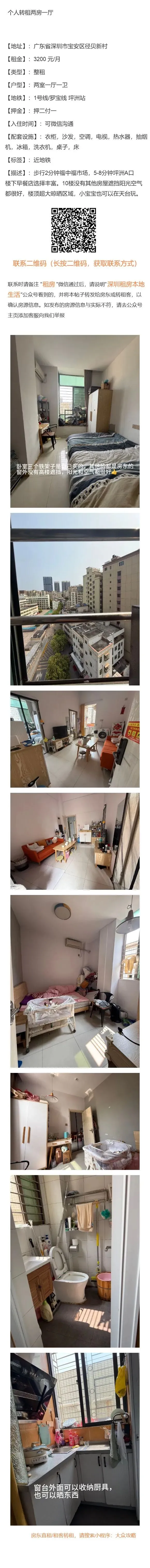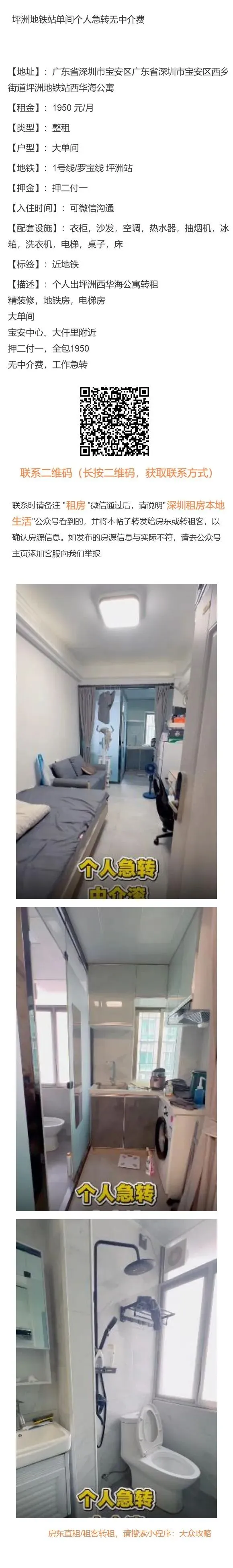 【深圳租房本地生活:免责申明】以上内容受用户委托发布,谢绝转载。房源信息的真实性、合法性由提供者负责,本公众号不声明或保证内容之正确性和可靠性,深圳租房需谨慎,请先核实出租人身份,仔细阅读租房合同,切勿轻易转账、交订金等,房屋出租过程中产生的一切问题,与本公众号无关。【深圳租房本地生活:特别申明】深圳租房本地生活没有任何线下业务人员,请勿轻信冒认我司线下工作人员及电话沟通人员,我司目前唯一对外沟通窗口为公众号主页客服微信:Hey_Beijinger