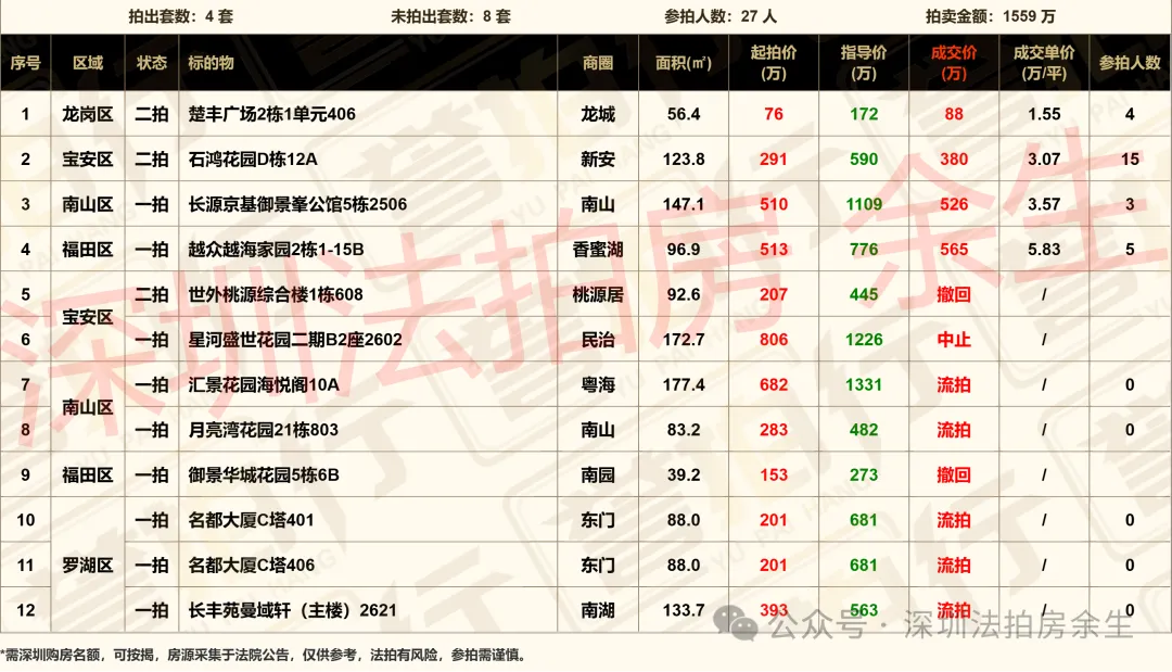警示: 比如罗湖名都大厦的两套住宅,起拍价仅201万,却无人问津。可能存在潜在风险。