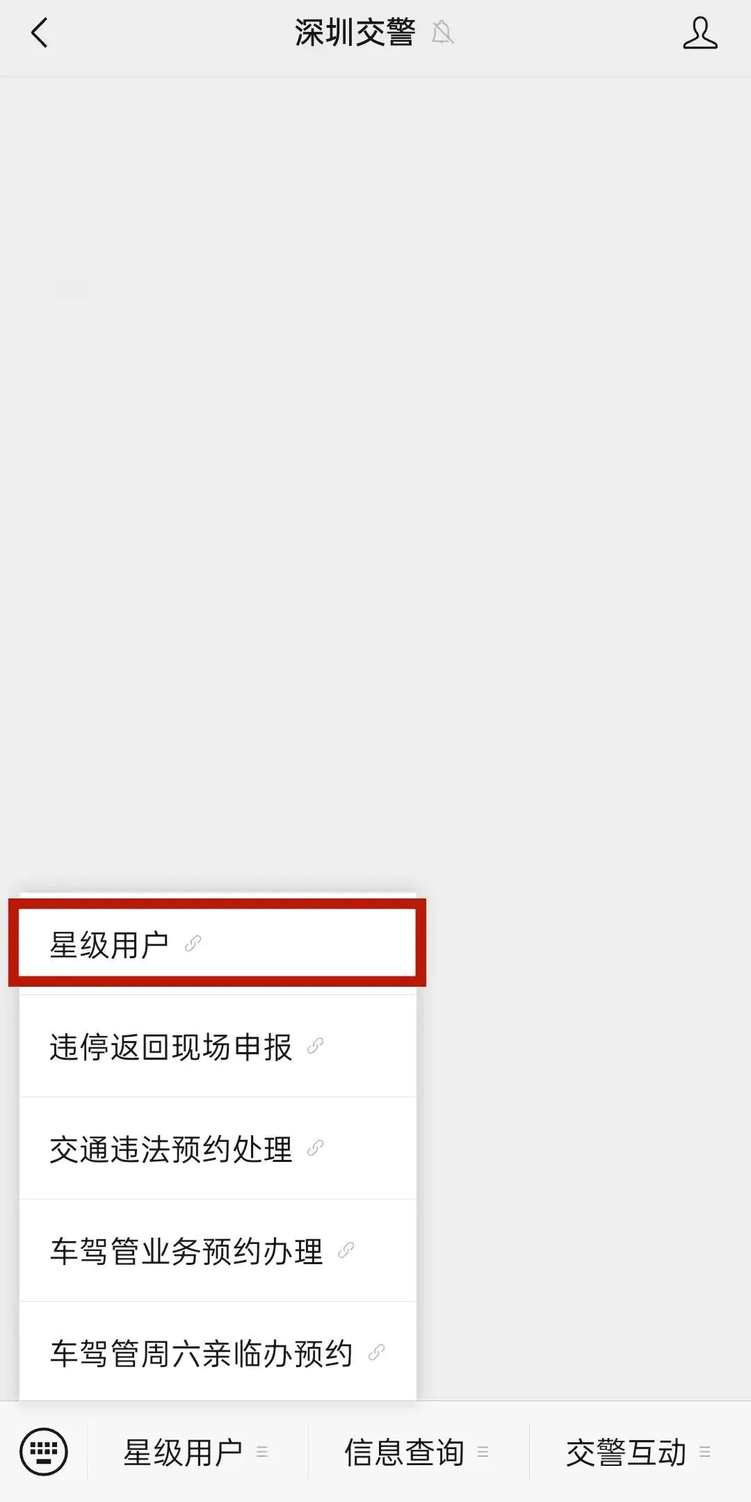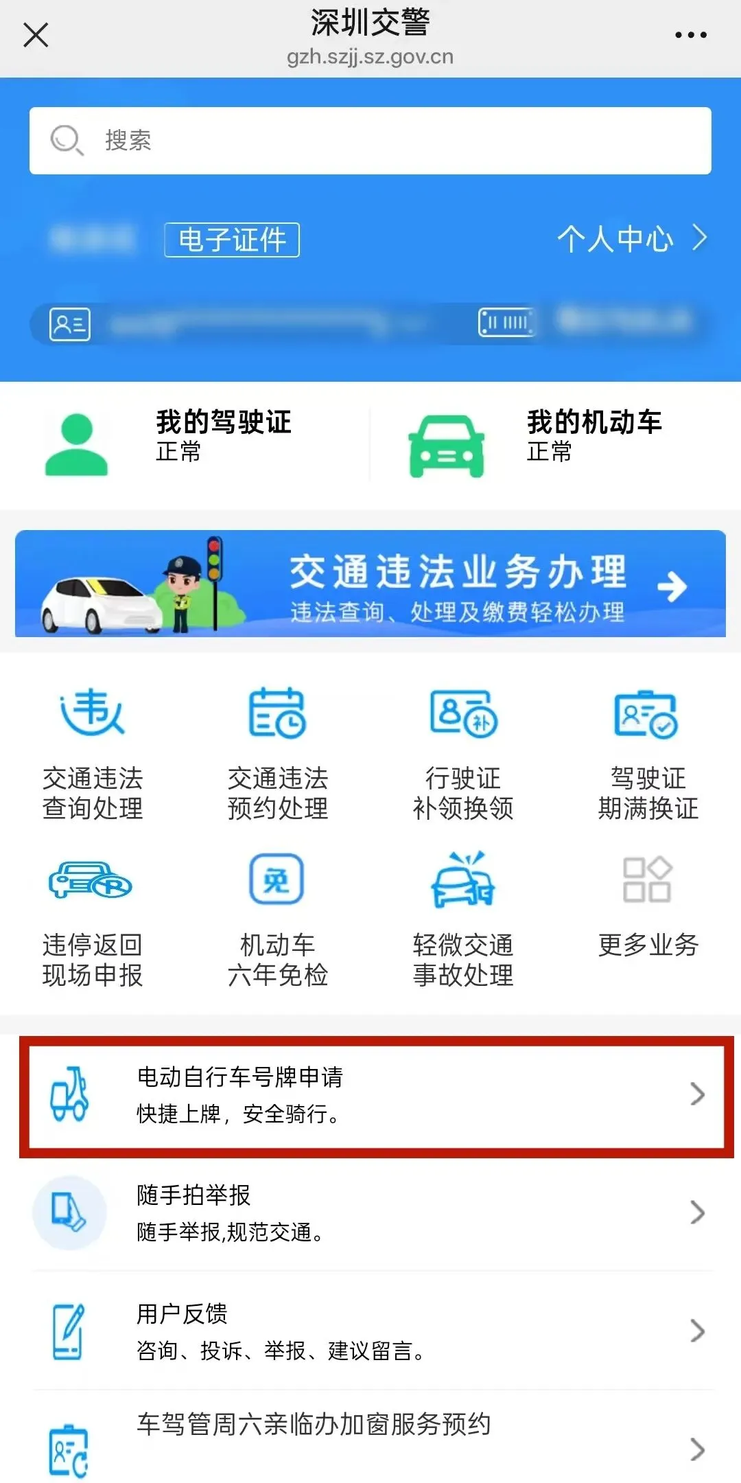 进入“深圳交警”或“深圳交警权威发布”微信公众号,登录“星级用户”,选择“电动自行车号牌申请”。
