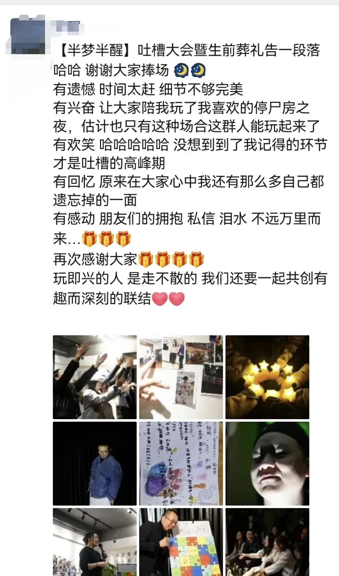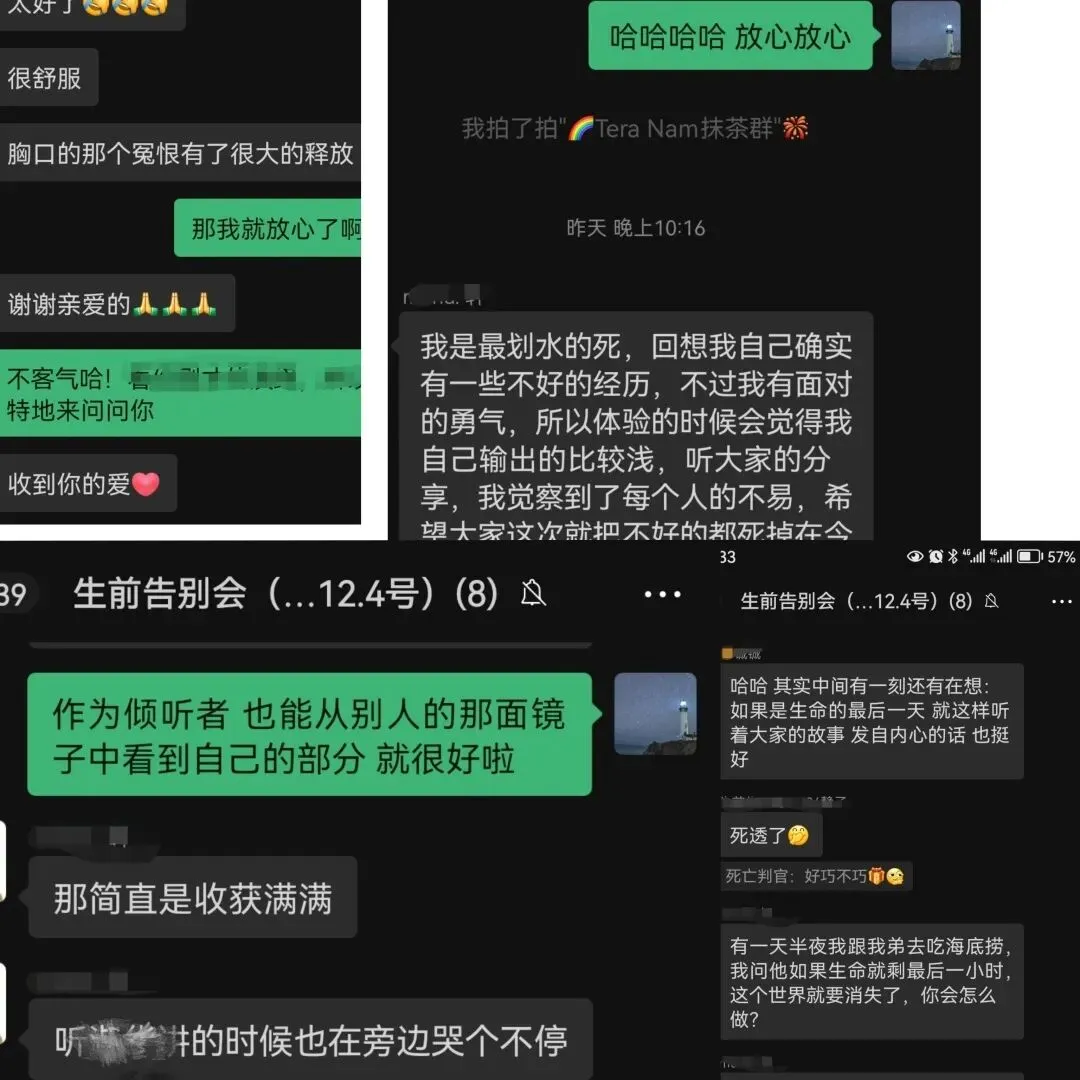 我们会从现场的伙伴中招募生前葬礼的体验者,然后由其余参与者在短时间内完成从需求调研+创意策划+流程设计+执行布场的完整闭环