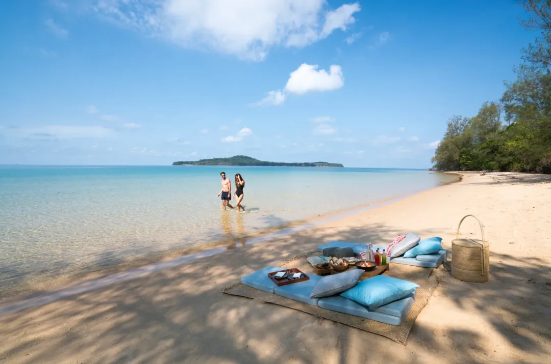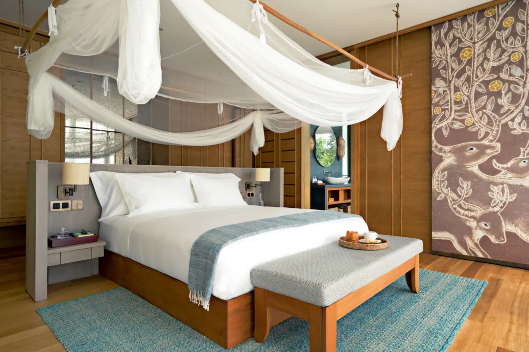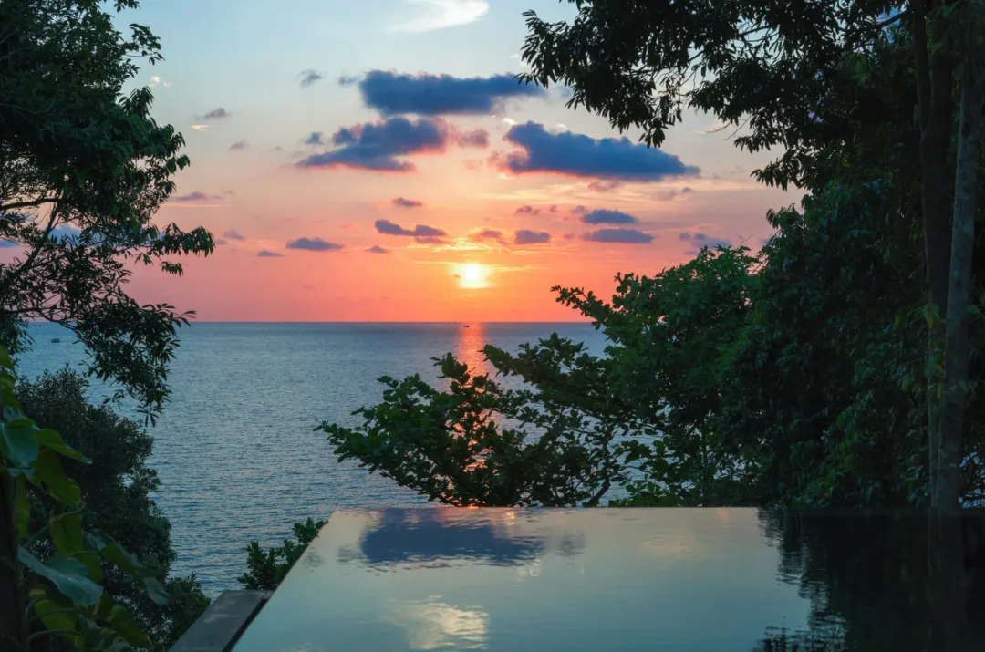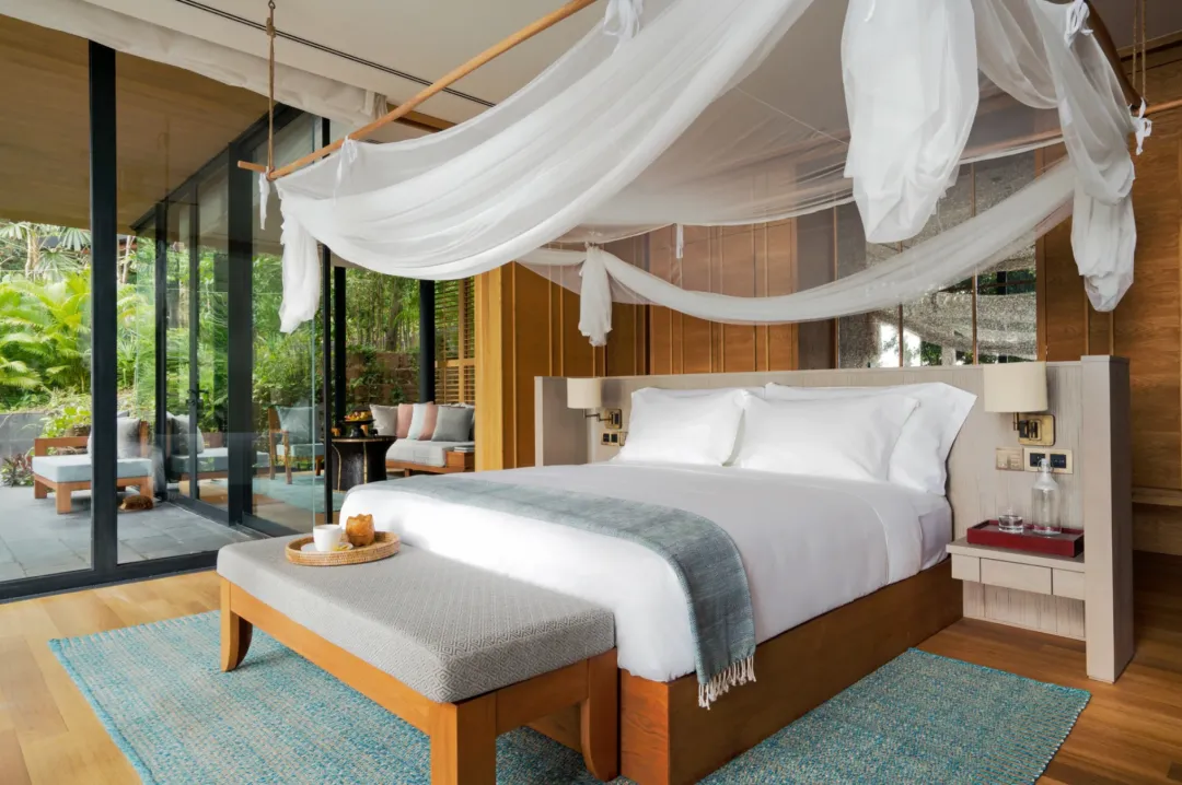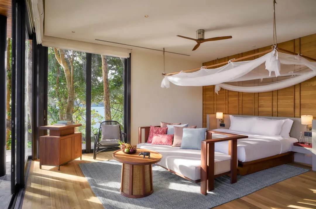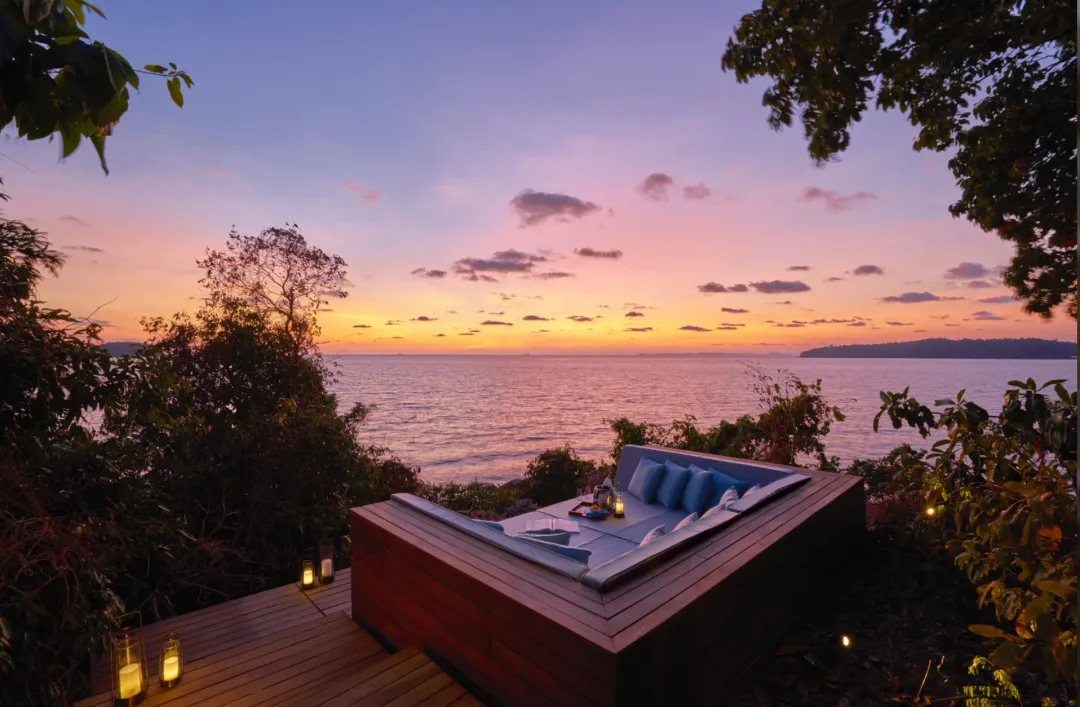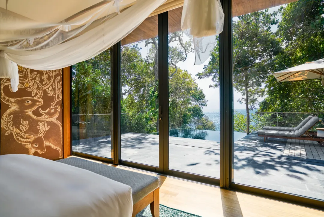 从酒店客房和私人泳池露台上可远眺柬埔寨海岸线和岛屿全景。卧室带有套内浴室,宽敞的起居空间一直延伸到泳池露台,此外全落地玻璃窗充分利用了自然光线,让整个空间通透敞亮。