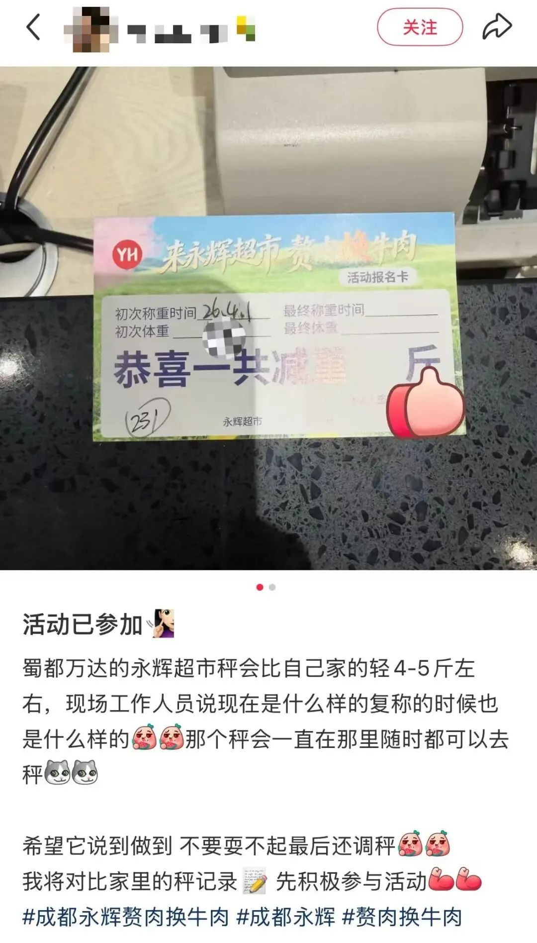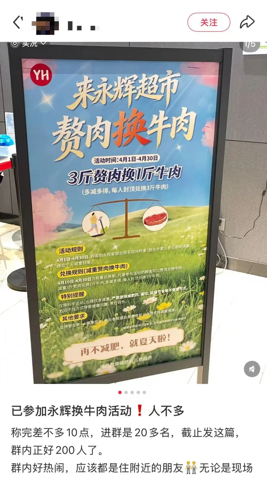 据悉,4月1日至30日,永辉超市全国门店同步上线“来永辉,赘肉换牛肉”活动,减重3斤即可兑换1斤牛肉、鲜活小龙虾或佳沛奇异果(三选一),每人封顶可兑换3斤。