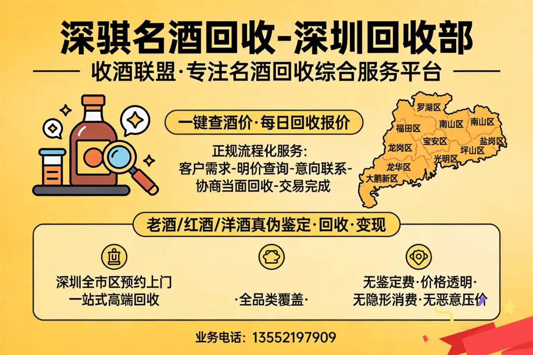 【深骐名酒回收-深圳回收部】业务电话:13552197909,直接面向【深圳】全市区广大客户,提供老酒、红酒、洋酒等酒类的真伪鉴定、回收以及变现服务。回收价格专业且可靠。提供【深圳】全市区域预约上门回收的省心服务,实现全品类覆盖,打造一站式高端回收服务平台,无需客户多方奔走,就能满足各类闲置珍品的变现需求。全程不收取任何鉴定费用,回收价格公开透明,严格参照市场实时行情,结合酒品年份、品相、稀缺度科学定价,主动向客户说明定价依据,无任何隐形消费、无恶意压价,让客户明明白白交易。