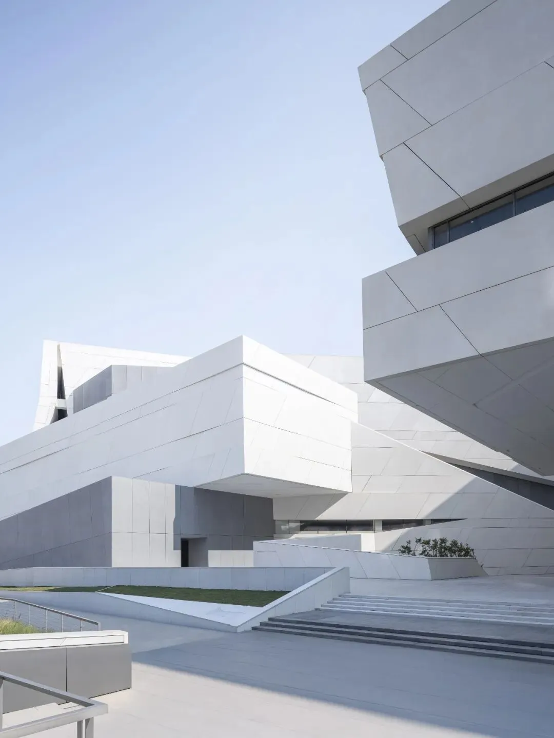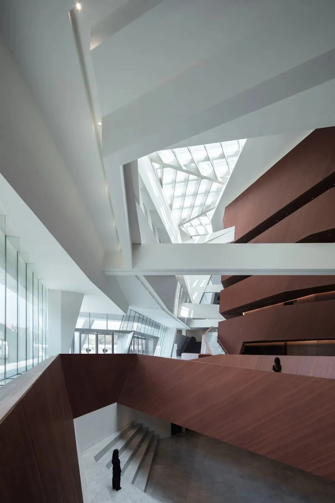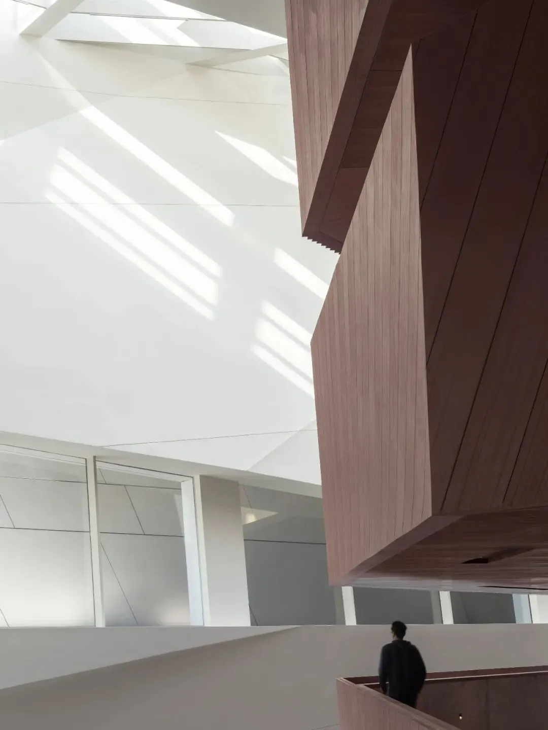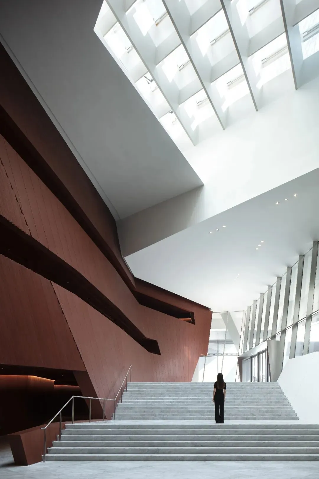 连绵屋面下的三馆公共空间分别以“山”(大剧院)、“谷”(群艺馆)、“林”(图书馆)为主题进行空间的铺陈。大剧院建筑外部采用 UHPC,犹如自然堆砌的大理石石块,洁净而优雅。室内设计沿用了建筑外部的体块感,通过对木饰面的使用,营造出内部温暖的公共空间,欢迎着访客的到来。设计将丰富而清晰的流线嵌入造型体量之中,观众依山势前行,沐浴天光,峰回路转之间,人们用脚步去丈量这座自然与艺术的殿堂。
