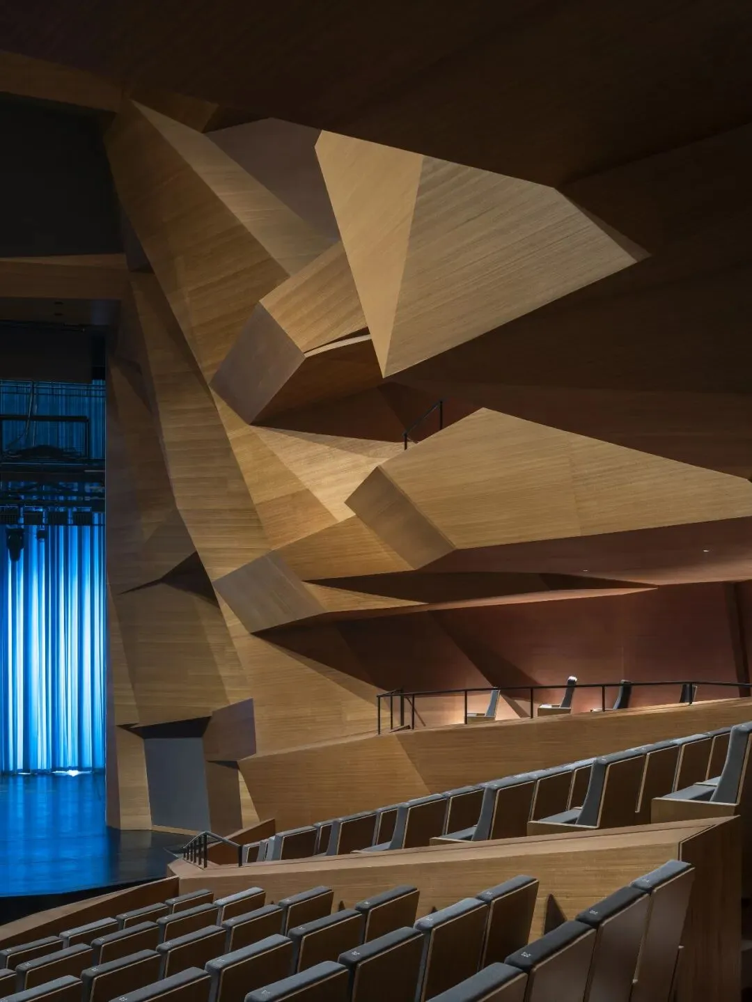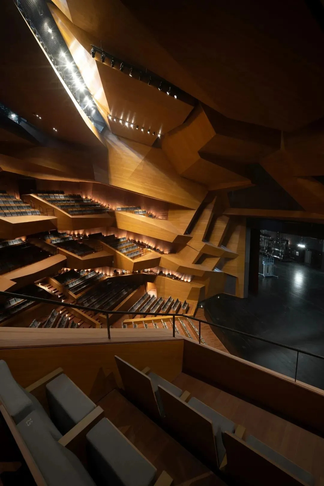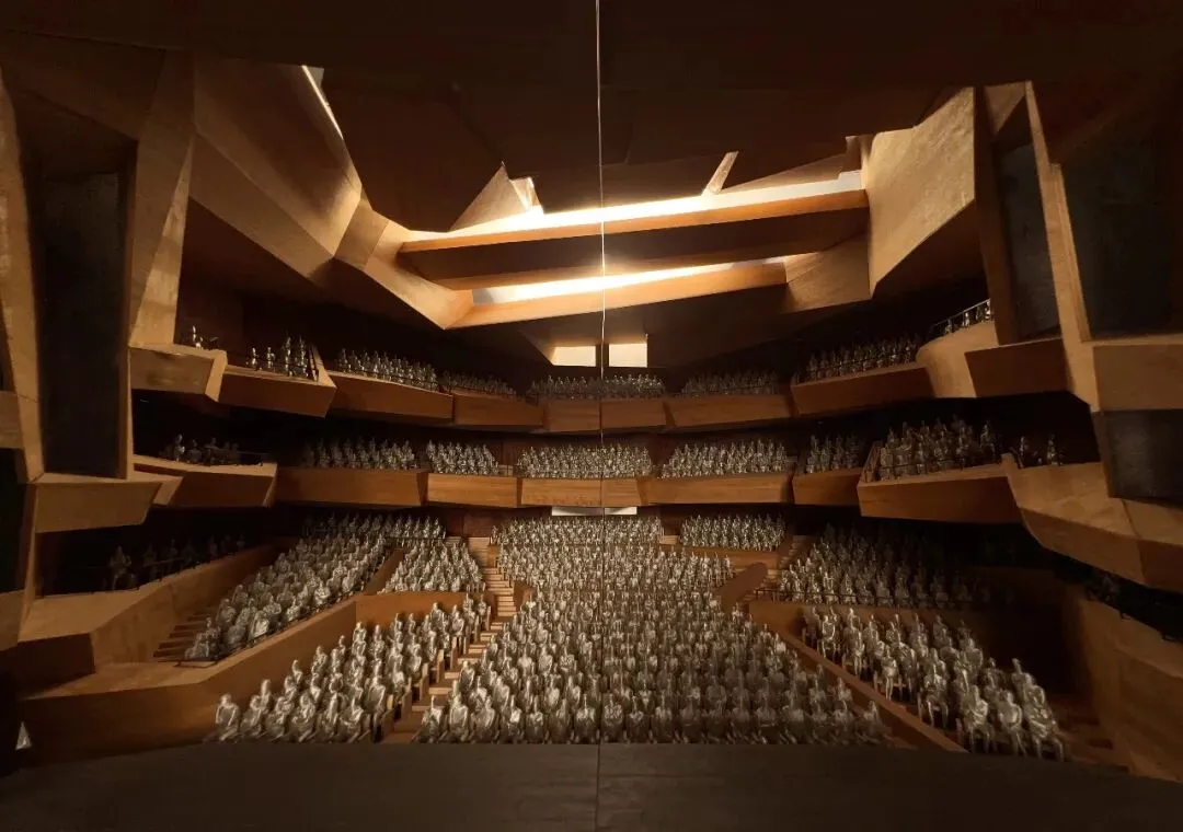 1418 座大剧场的内部设计,是流线的终章,也是反转 —— 此处的 “山石”,不再外向起伏,而是向内围合;它的演出类型包括了话剧、音乐剧、舞剧、音乐会等不同形式;28 米的剧场视距(声学混响时间 1.4±0.1s)为剧场打造了亲和的演出空间;灵感来自于意大利石材采矿山的造型,葡萄园式的剧院观众席营造了剧院类型的新范式,从不同角度望去,动态的体块和隐于其中的观众,通过两侧不对称的耳光墙环抱着舞台,演员与观众彼此成为表演中不可或缺的一部分。