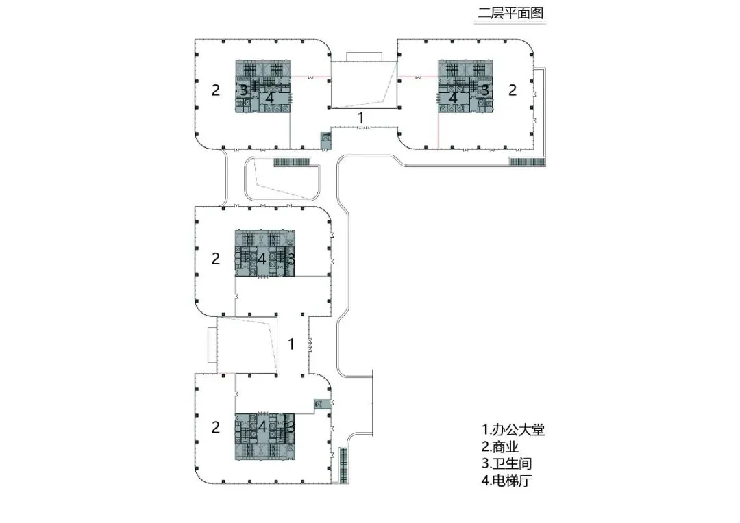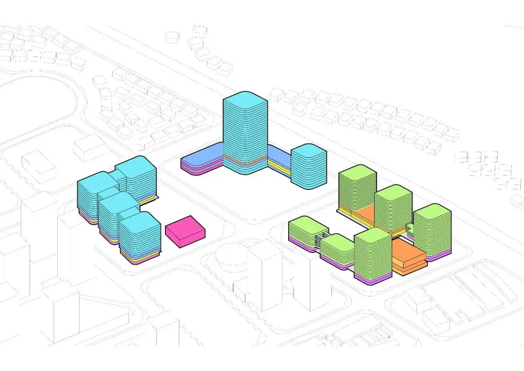 这种类似乐高式模块化布局是本项目的一大创新点,该设计将建筑划分为若干功能模块,每个模块通过中庭的连通性与独立性相结合,既保证了各功能区域的相对独立,又促进了彼此之间的互动与协作。这种布局的优势在于其高度的灵活性,能够根据企业未来事业部门的发展需求快速调整功能分区,从而适应不断变化的工作模式与组织架构。