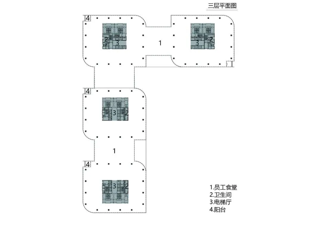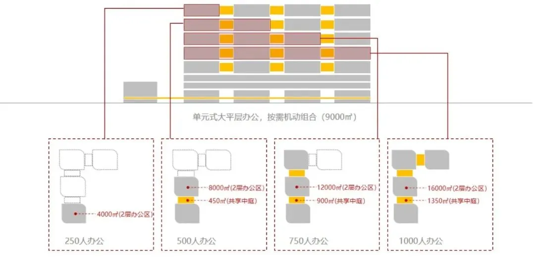 美的集团总部三期由4栋14层办公塔楼及1栋3层城市客厅组成,整体建筑高度达到66.1米,单层塔楼面积为2000平方米,而每个中庭面积达500平方米,每两层建筑加一个中庭面积约4500平方米为一个基本单元。
