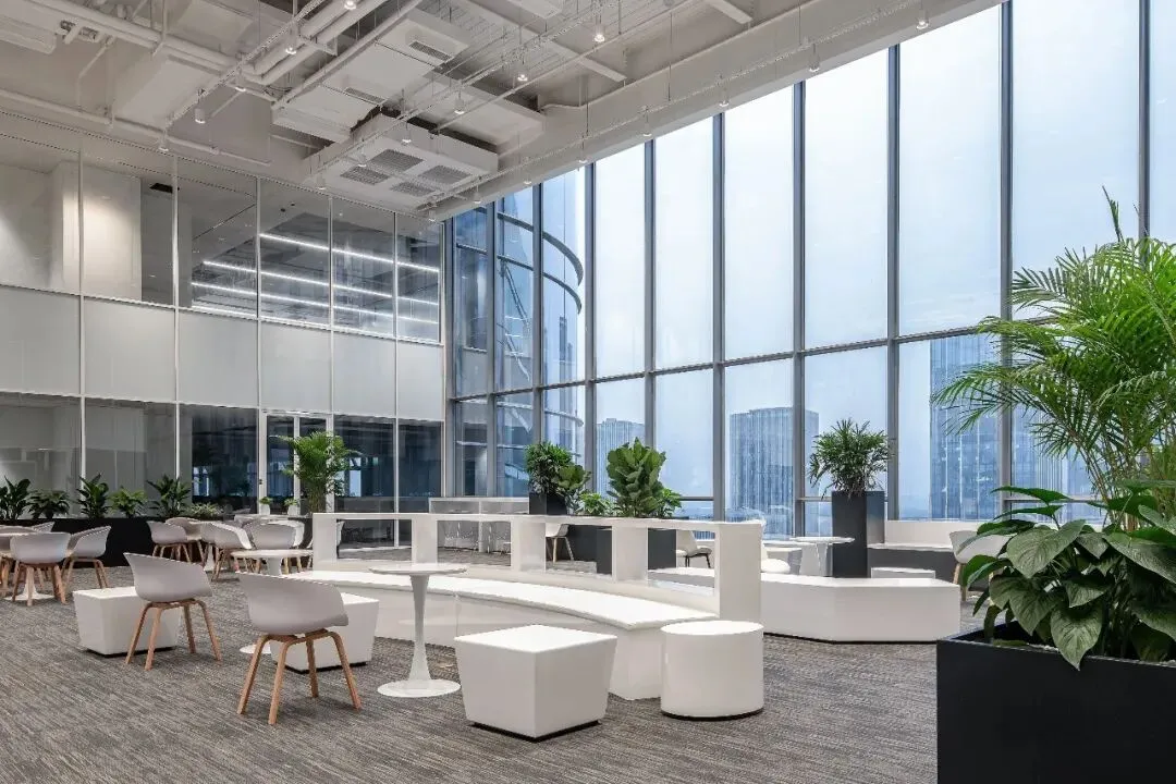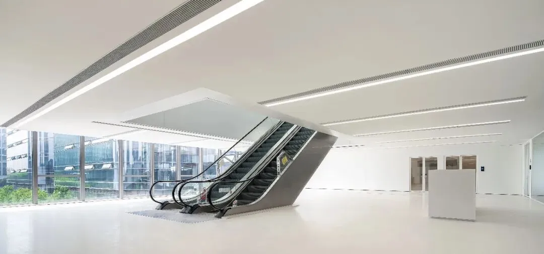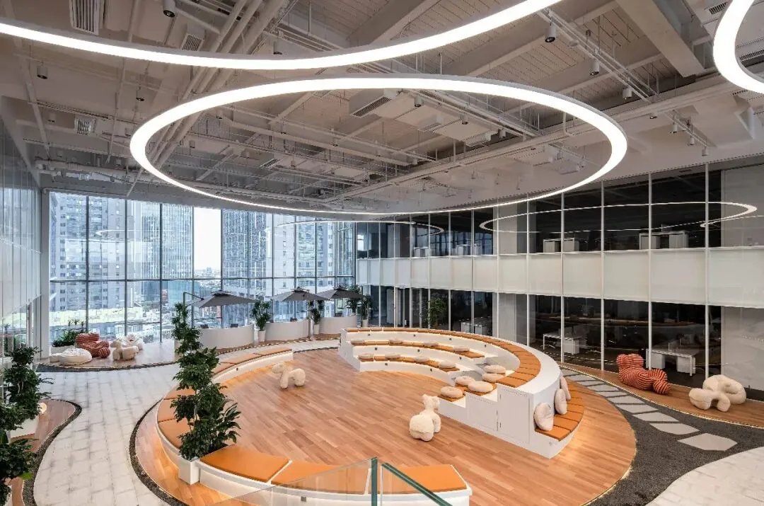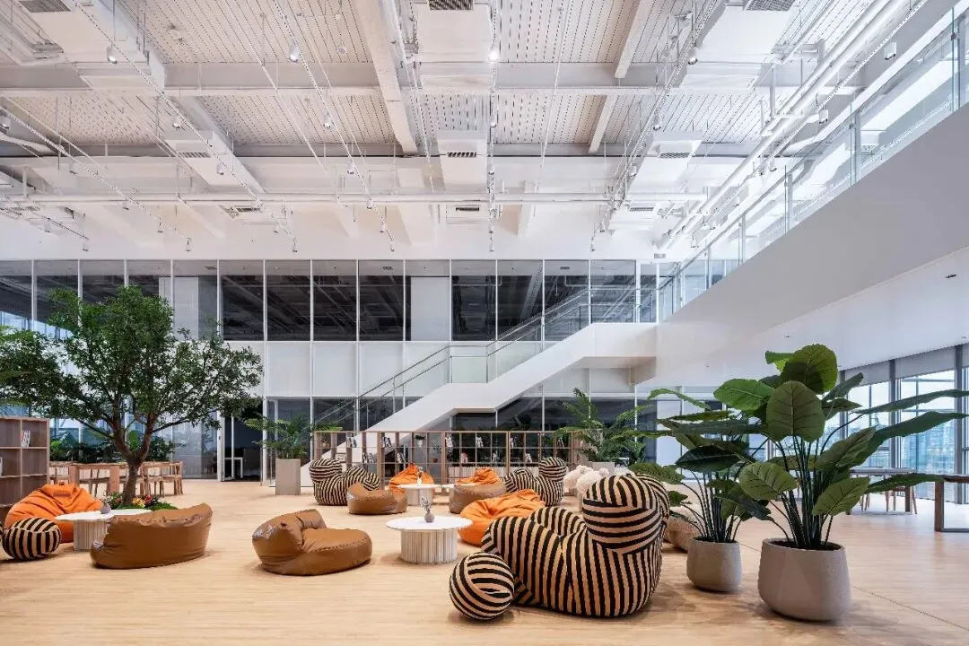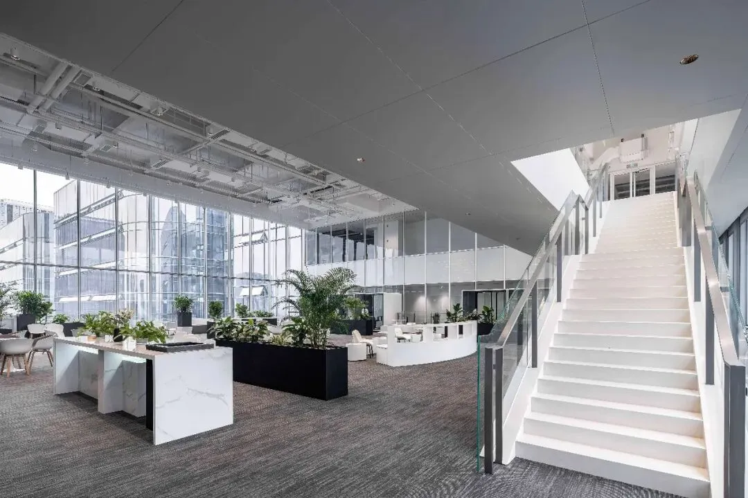 同时这种设计方式不仅提升了空间的层次感,还增强了整体建筑的流动性。通过在中庭区域引入自然光线与景观视野,办公空间被赋予了更加开放与通透的特质。中庭结合每一个事业部自身的特点,既是一个彼此展示个性的场所,也是一个兼功能多变性、绿色流动及相互交流的复合空间。