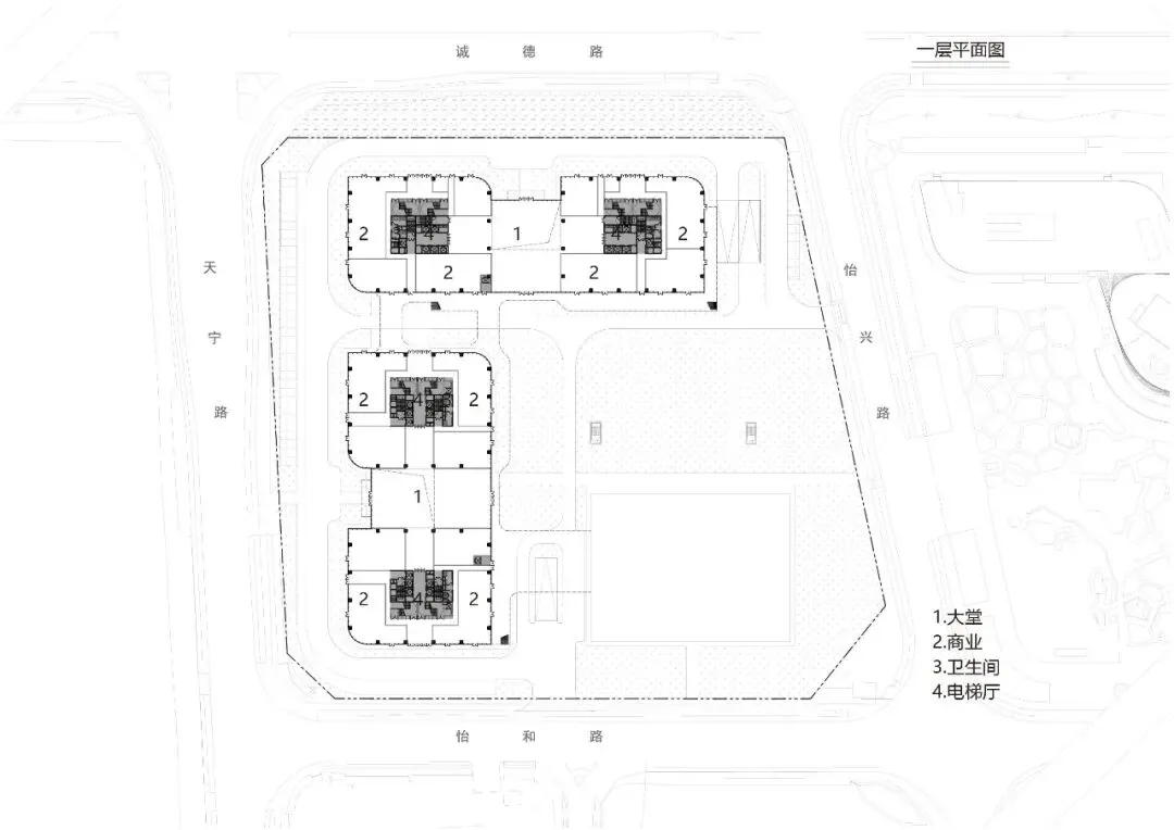 围合院落,中心花园,追求统一,突出主体;将美的与盈峰大厦、和美术馆统一考虑,形成外圈塔楼高低错落,内部多层的整体形象。