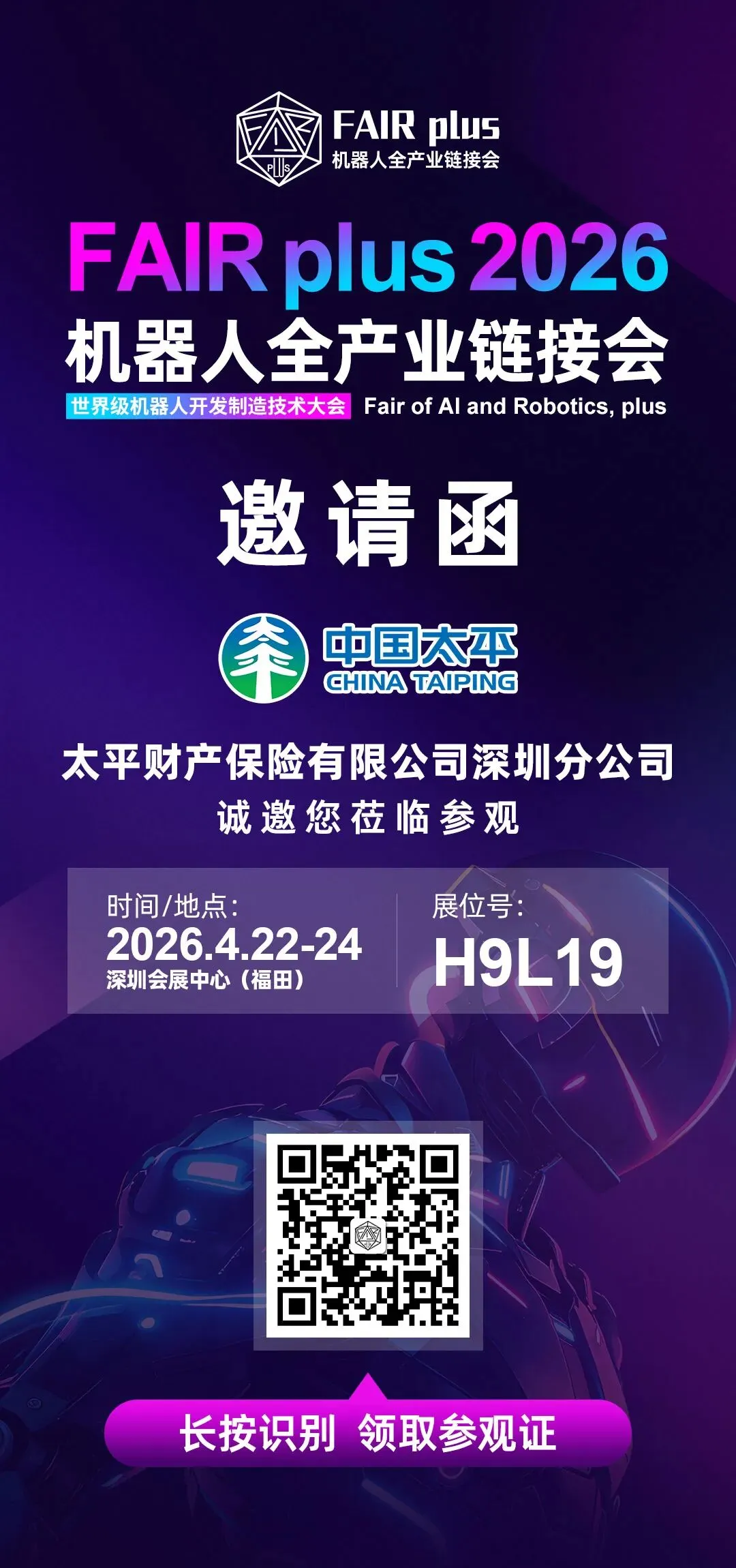 目前,太平财险深圳分公司已计划参展2026年4月22日在深圳福田启幕的“机器人全产业链接会FAIR plus 2026”。更多有关太平财险深圳分公司的技术、产品及参展消息,欢迎关注“机器人全产业链接会FAIR plus”公众号。
