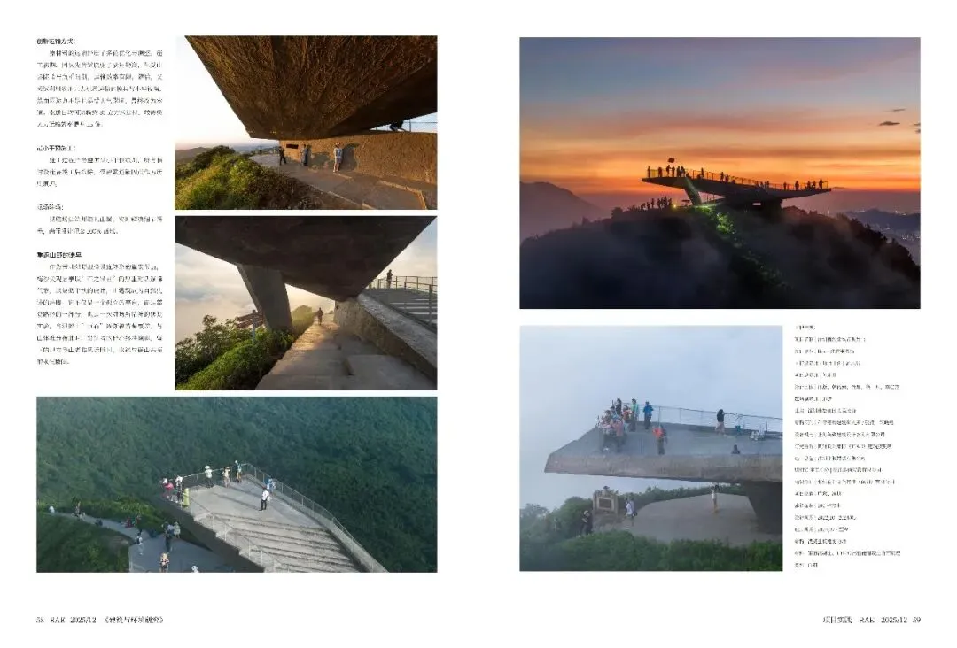 梅沙尖观景台不是一座孤立的亭台,而是攀登路径的延续,也是对场所精神的修复实验。上层悬挑平台刺破云层,下层3米深“石穴”提供庇护,登山路径穿行其间,如自然生长。