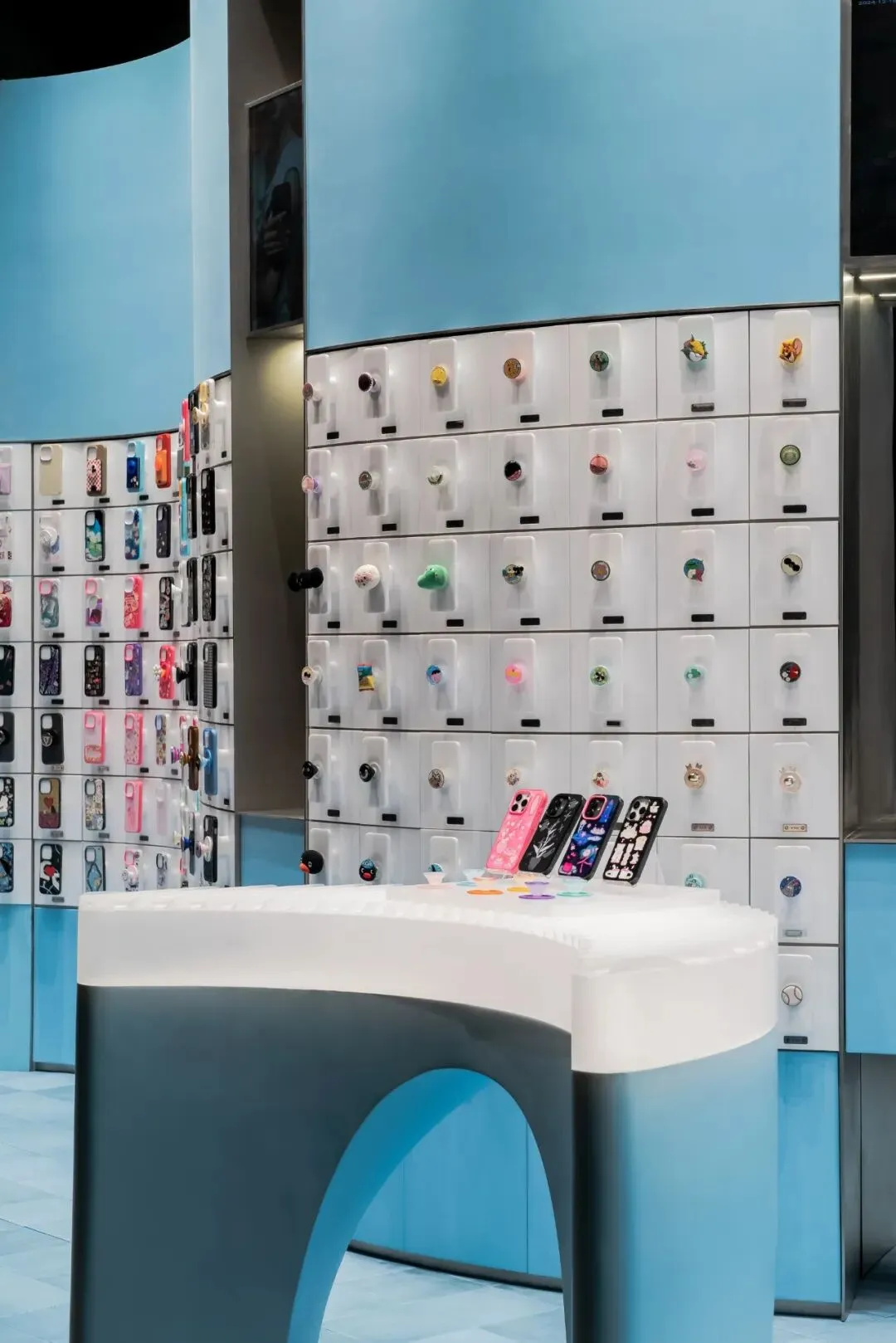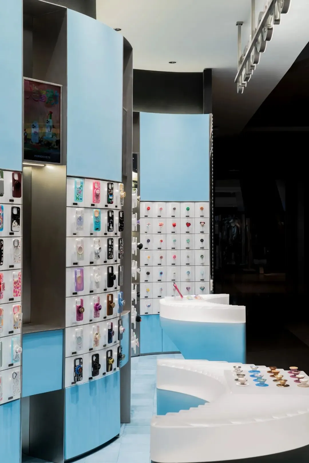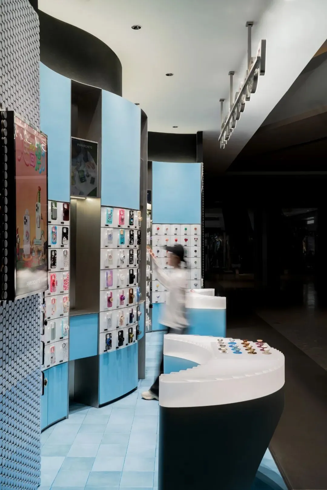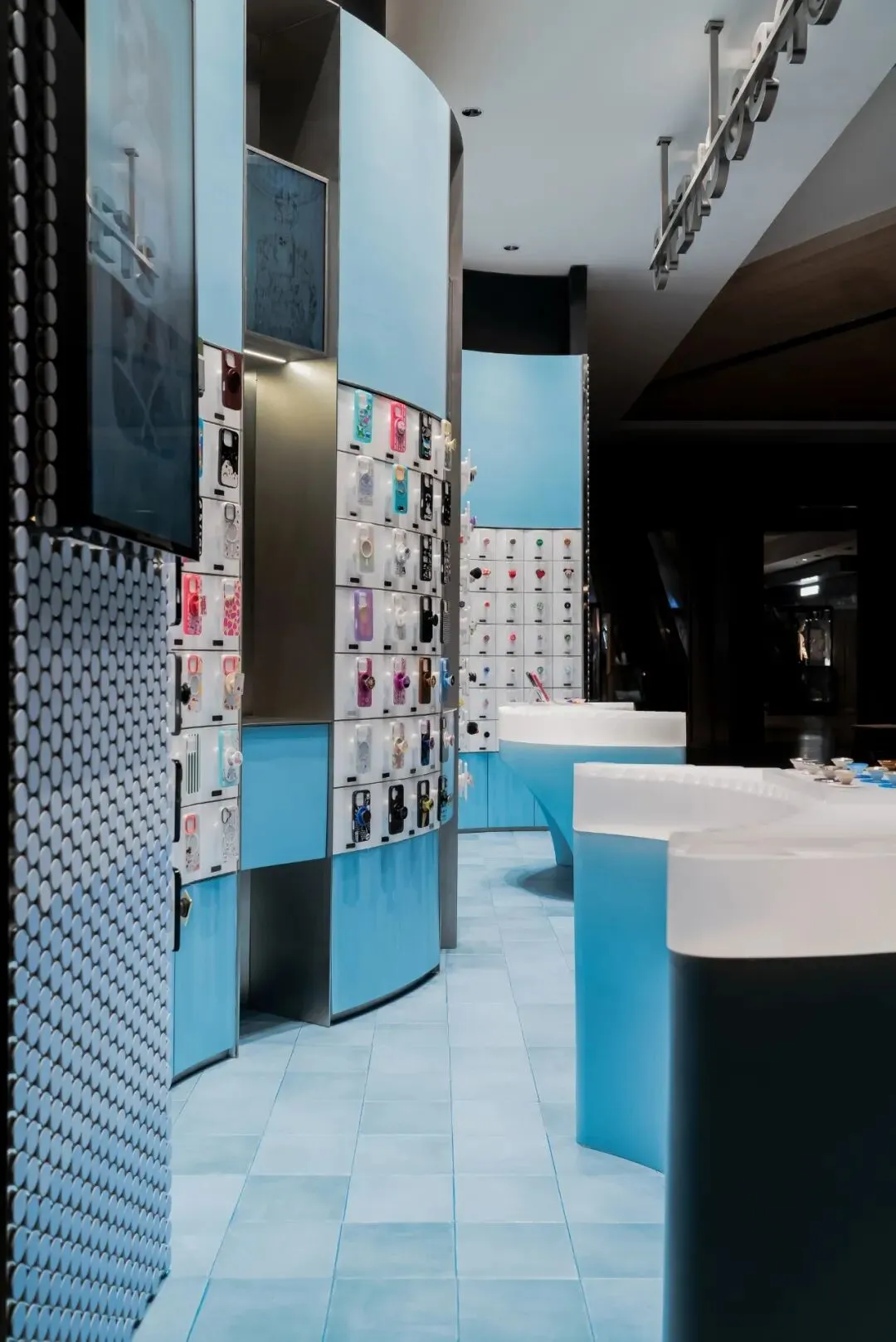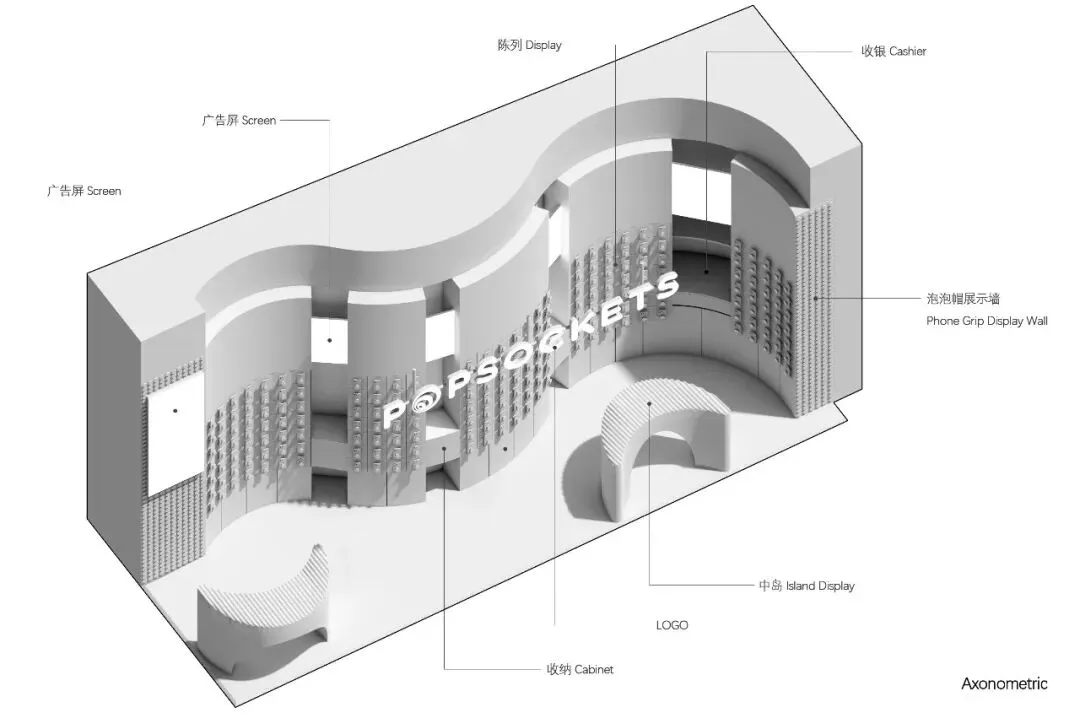 色彩的选用上延续了泡泡骚在各城市的策略——每家正式门店都拥有独特的主题色与专属主题。此次深圳的首店,基于深圳临海的城市特质,我们以“潮汐矩阵”作为设计概念,采用蓝色作为店铺的主题色。蓝色不仅呼应了海洋与潮汐的意象,也赋予空间清新且富有层次感的视觉体验,同时传达出品牌对于当地文化的契合与独特的区域表达。关于造型,大多数人会直观地认为横平竖直的布局能够最大化陈列SKU且空间的利用率高,但我们的实践表明,弧形设计不仅能够比传统的线性布局陈列更多SKU,还能更好地契合空间的主题性。弧形的设计经过多轮推敲和调整,以确保其与场地现状相协调。我们最终采用的三段弧形曲线,均源自标准圆形的部分切割,形成了无机的几何形态。这些无机曲线具备高度的可加工性和可复制性,能够通过现代化的工艺精确呈现。此外,三段弧形之间留有适应现场条件的小弧,具备灵活的可调节性。小弧的下方设计为台面,为顾客提供操作和展示的空间;而小弧的上方则嵌入了LED显示屏,方便品牌方灵活更新宣传内容和展示物料。通过这种设计,我们优化了SKU的展示效果,也增强了顾客的交互体验,确保了空间的美观与功能性的统一。立面我们细分为四个段落,经过多次尝试与验证后,确认了最佳且有效的陈列高度范围为离地500mm-1900mm之间。因此,将这一区段作为核心区域用于SKU的主要展示,以确保商品能处于顾客的最佳视线范围内,提升购物体验。陈列区的下方设计为储藏空间,用于存放备用商品和库存物料,便于员工快速补货与周转。而上方区域则作为品牌形象展示空间,突出品牌理念及特色商品,增加视觉吸引力。最上方600mm的区域则是考虑到与商场整体视觉系统的统一性,保持立面与公共区域的连续感,确保品牌形象的融入度与商场整体环境的协调性。收纳设计上,在与品牌方多次沟通后,对收纳方案进行了优化升级。原有店铺的柜门式收纳存在一定的局限性:柜门的开合导致陈列物只能居中展示,且作为展示品的泡泡帽同时承担了柜门拉手的功能,这在使用过程中会造成一定的不便,影响商品的展示效果与日常操作的效率。为了解决这一问题,我们将原有柜门式收纳升级为抽屉式收纳。抽屉设计不仅提升了收纳的灵活性,方便员工快速拿取和补充物料,同时优化了操作体验,减少了商品展示和储藏之间的干扰。抽屉的设计使得存取更加顺畅,避免了柜门开合对顾客视线的干扰,也进一步提升了店内空间的功能性与使用效率。项目信息