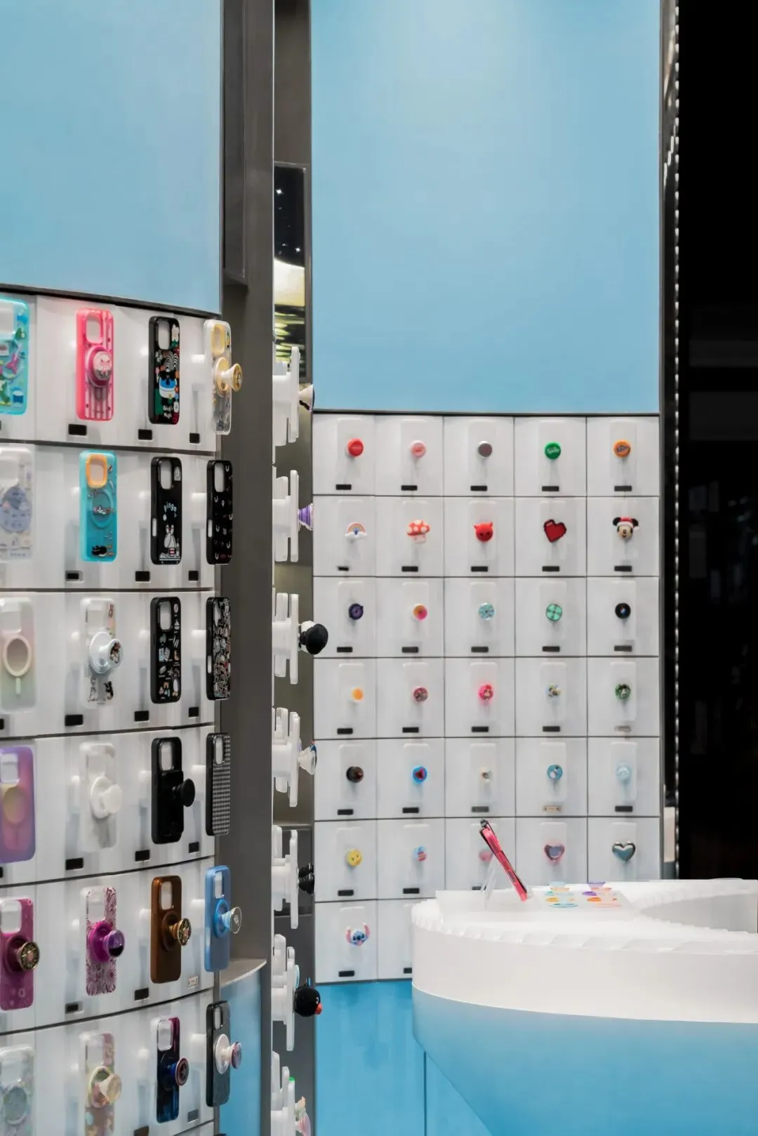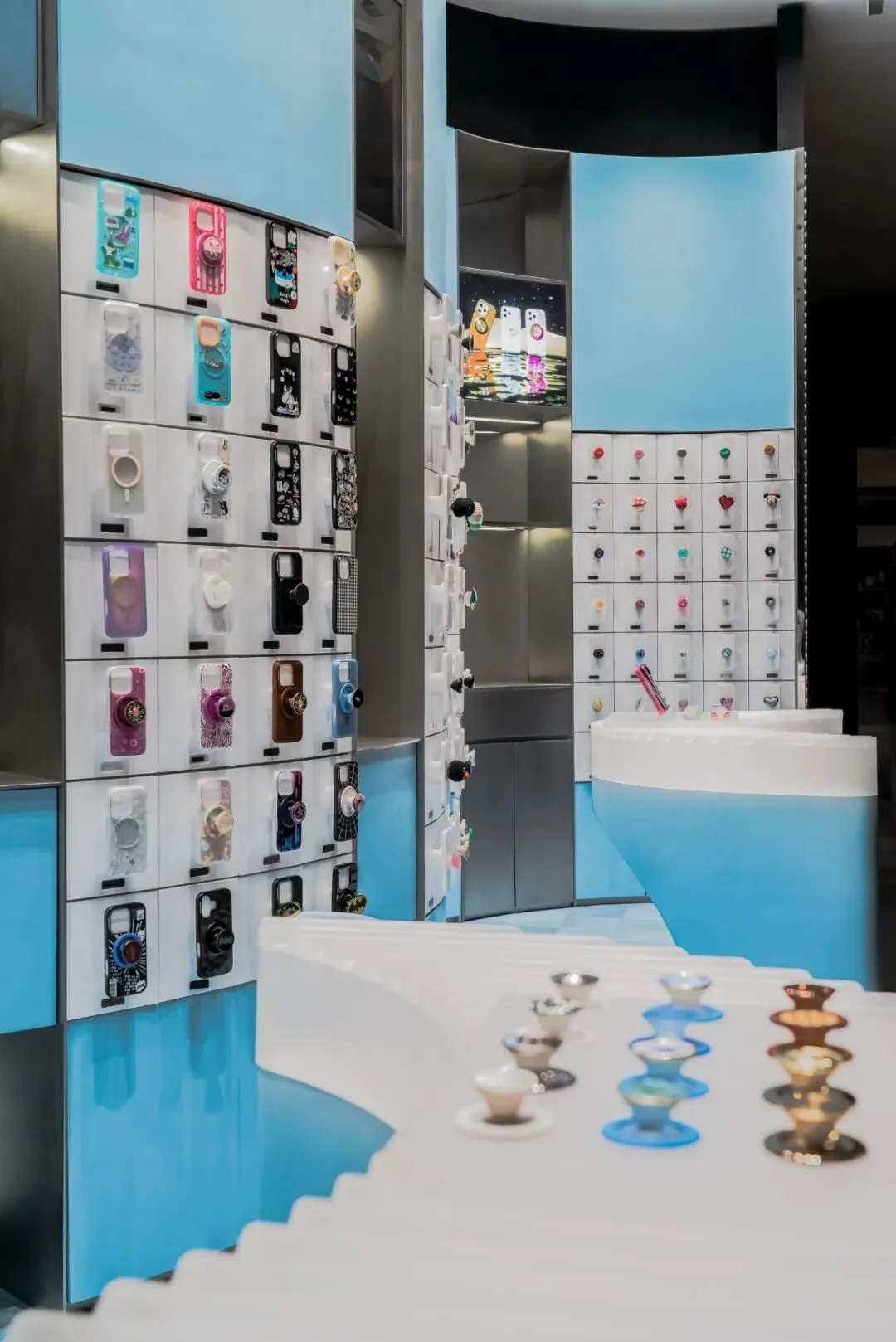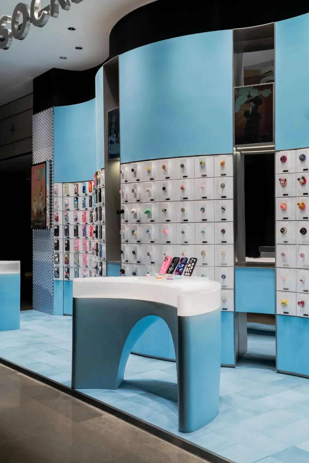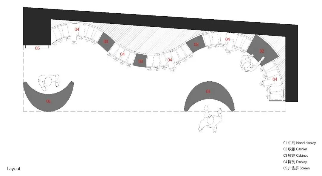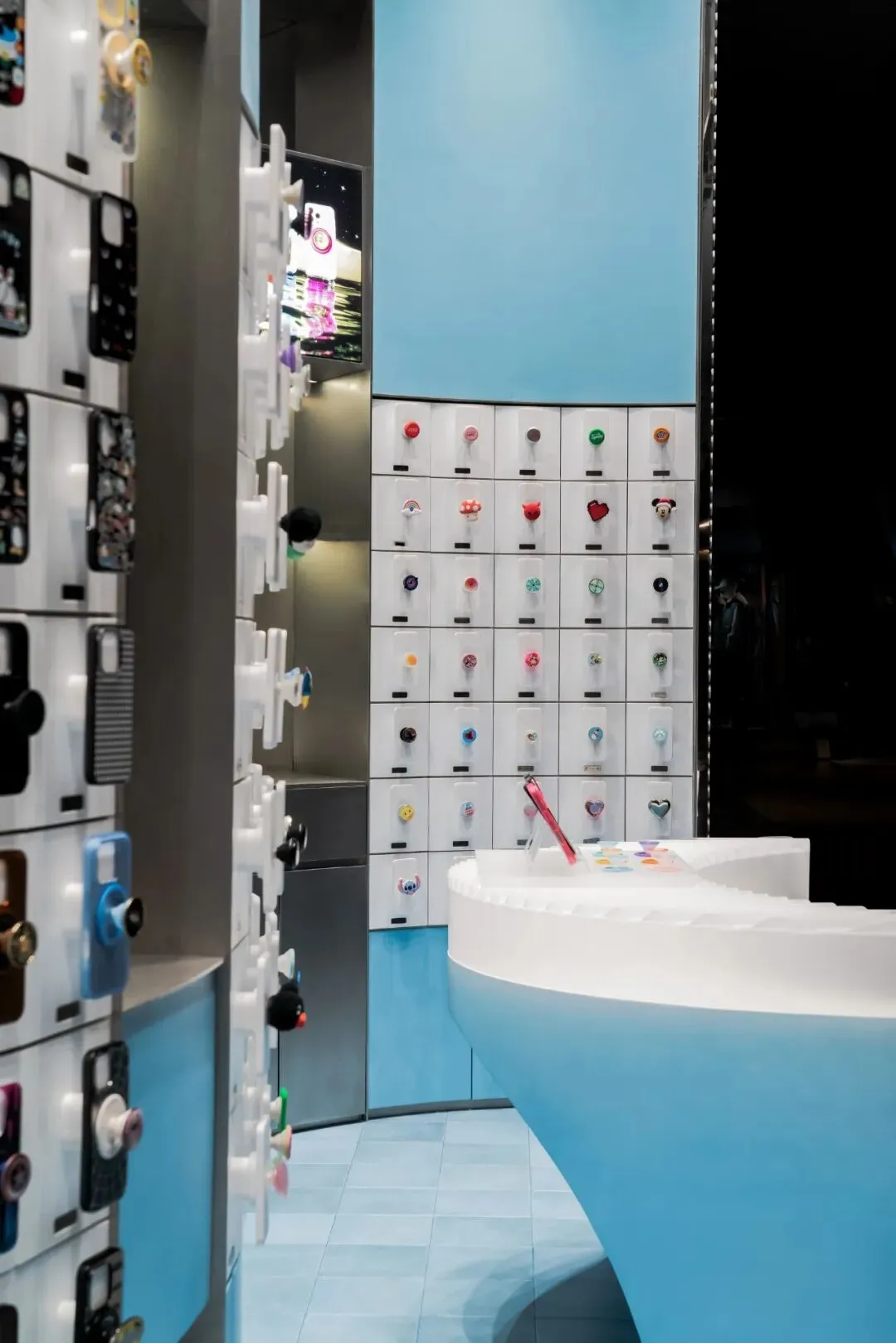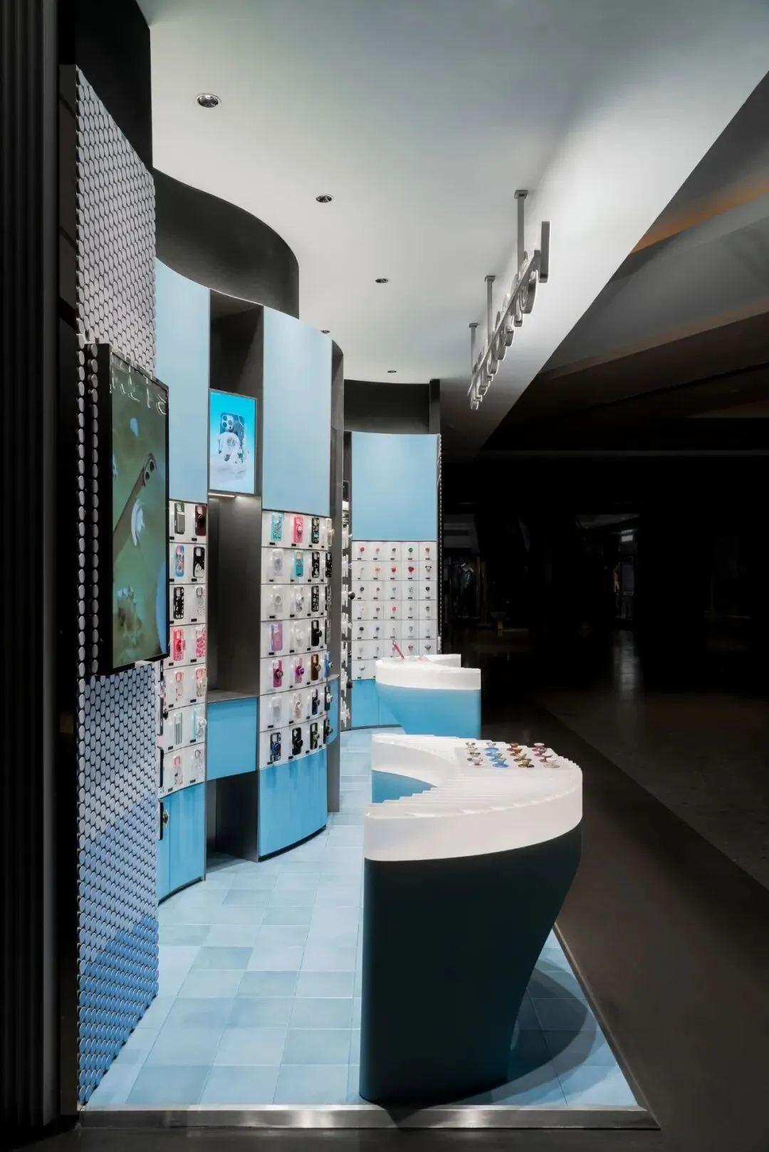 色彩的选用上延续了泡泡骚在各城市的策略——每家正式门店都拥有独特的主题色与专属主题。此次深圳的首店,基于深圳临海的城市特质,我们以“潮汐矩阵”作为设计概念,采用蓝色作为店铺的主题色。蓝色不仅呼应了海洋与潮汐的意象,也赋予空间清新且富有层次感的视觉体验,同时传达出品牌对于当地文化的契合与独特的区域表达。关于造型,大多数人会直观地认为横平竖直的布局能够最大化陈列SKU且空间的利用率高,但我们的实践表明,弧形设计不仅能够比传统的线性布局陈列更多SKU,还能更好地契合空间的主题性。弧形的设计经过多轮推敲和调整,以确保其与场地现状相协调。我们最终采用的三段弧形曲线,均源自标准圆形的部分切割,形成了无机的几何形态。这些无机曲线具备高度的可加工性和可复制性,能够通过现代化的工艺精确呈现。此外,三段弧形之间留有适应现场条件的小弧,具备灵活的可调节性。小弧的下方设计为台面,为顾客提供操作和展示的空间;而小弧的上方则嵌入了LED显示屏,方便品牌方灵活更新宣传内容和展示物料。通过这种设计,我们优化了SKU的展示效果,也增强了顾客的交互体验,确保了空间的美观与功能性的统一。立面我们细分为四个段落,经过多次尝试与验证后,确认了最佳且有效的陈列高度范围为离地500mm-1900mm之间。因此,将这一区段作为核心区域用于SKU的主要展示,以确保商品能处于顾客的最佳视线范围内,提升购物体验。陈列区的下方设计为储藏空间,用于存放备用商品和库存物料,便于员工快速补货与周转。而上方区域则作为品牌形象展示空间,突出品牌理念及特色商品,增加视觉吸引力。最上方600mm的区域则是考虑到与商场整体视觉系统的统一性,保持立面与公共区域的连续感,确保品牌形象的融入度与商场整体环境的协调性。收纳设计上,在与品牌方多次沟通后,对收纳方案进行了优化升级。原有店铺的柜门式收纳存在一定的局限性:柜门的开合导致陈列物只能居中展示,且作为展示品的泡泡帽同时承担了柜门拉手的功能,这在使用过程中会造成一定的不便,影响商品的展示效果与日常操作的效率。为了解决这一问题,我们将原有柜门式收纳升级为抽屉式收纳。抽屉设计不仅提升了收纳的灵活性,方便员工快速拿取和补充物料,同时优化了操作体验,减少了商品展示和储藏之间的干扰。抽屉的设计使得存取更加顺畅,避免了柜门开合对顾客视线的干扰,也进一步提升了店内空间的功能性与使用效率。项目信息