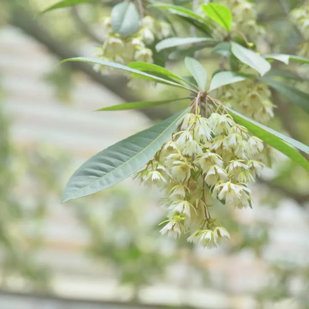 杜英的花不张扬,小小的白花,带着细碎的流苏感。你也许不会第一眼注意到它,但一旦留意,就会发现它们在很多街道和公园里悄悄开着。