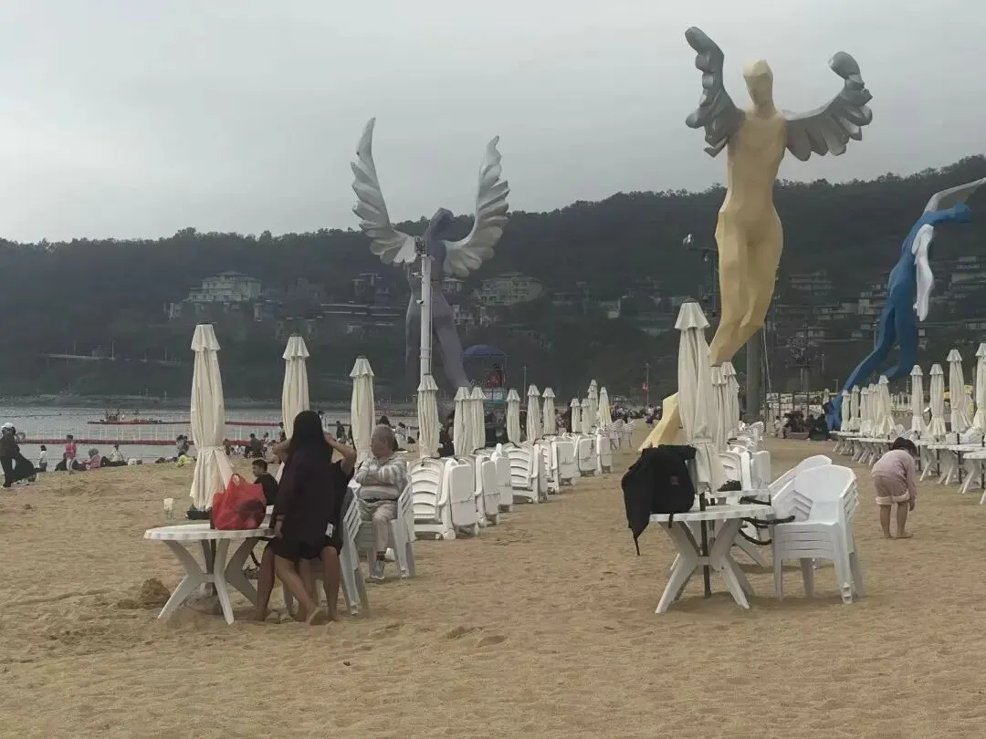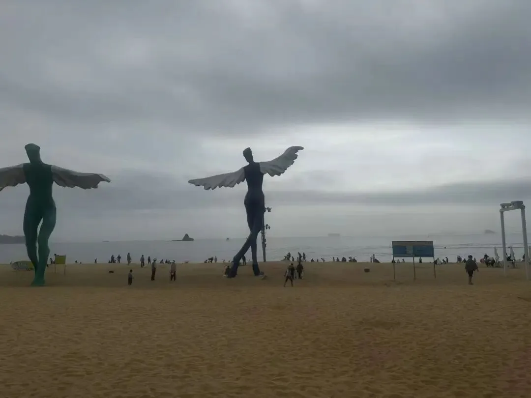 公园中心,太阳广场和月亮广场由432米长的“阳光走廊”相连。走廊顶棚上,繁茂的勒杜鹃开得正艳;廊内石凳上,已有早起的游人在此小憩。金色的沙滩上,不少游人正在戏水。然而最引人瞩目的,莫过于沙滩东部那七座迎风起舞的“愿望天使”雕塑——当地人亲切地称它们为“鸟人”。它们形态各异,仿佛要乘风飞去,与大梅沙自由、浪漫的气质完美契合。我打开手机,随意抓拍了几张照片,以留下永久的纪念。