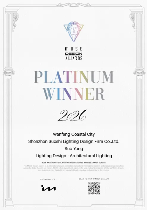 美国缪斯设计奖由国际奖项协会(IAA)主办,是国际设计领域具有较高影响力的专业奖项之一,涵盖建筑、室内、产品、景观、照明等多个类别。此次获奖,体现了万丰海岸城购物中心在建筑照明设计上的创新表达,也彰显了项目在城市界面塑造与商业空间营造方面的综合实力。