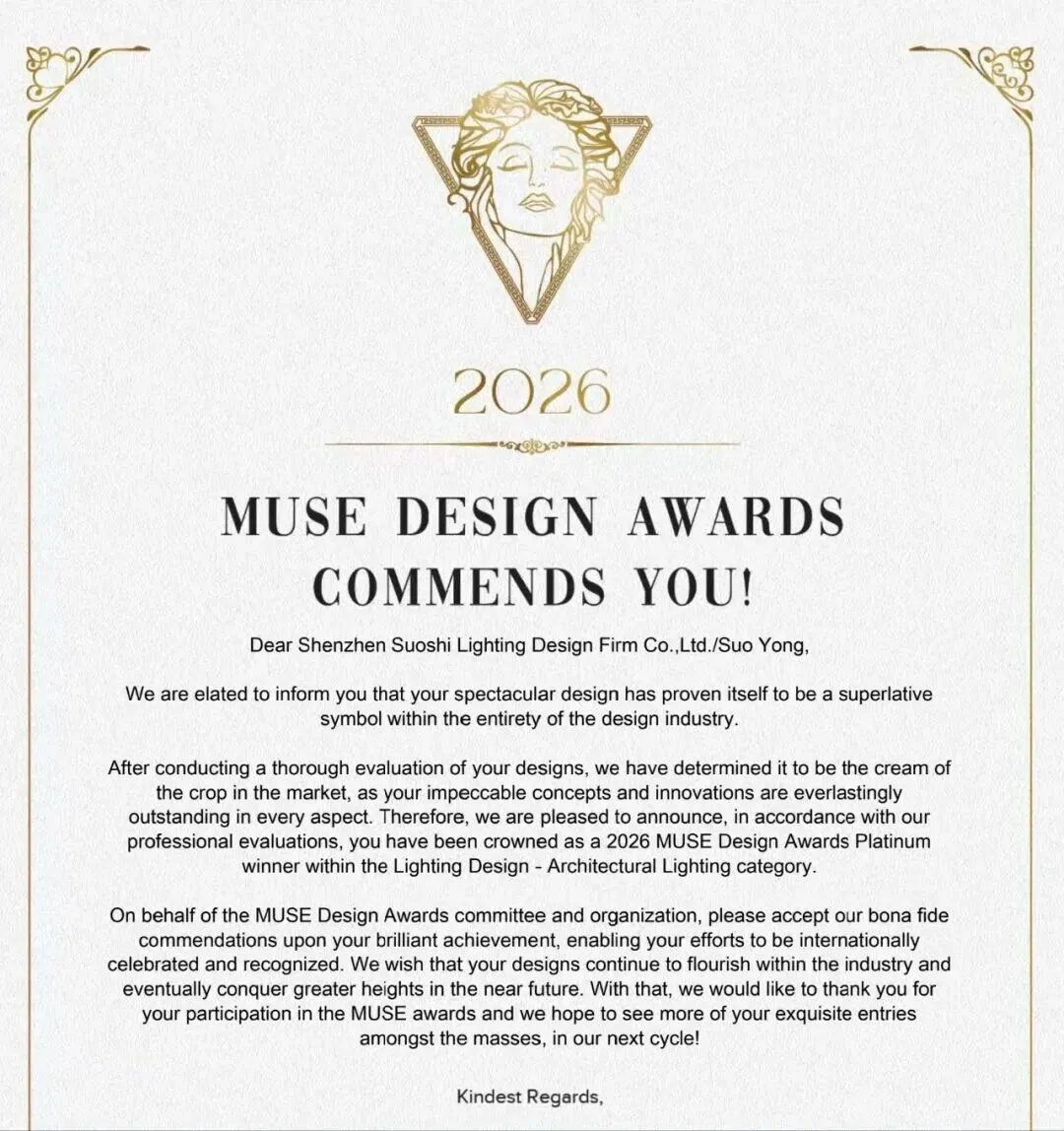 近日,2026美国缪斯设计奖(MUSE Design Awards)获奖名单公布,深圳潮人海外经济促进会荣誉会长李茂水、名誉会长李奕标企业海岸集团万丰海岸城购物中心凭借出色的建筑照明设计,荣获建筑照明类别最高奖——铂金奖。